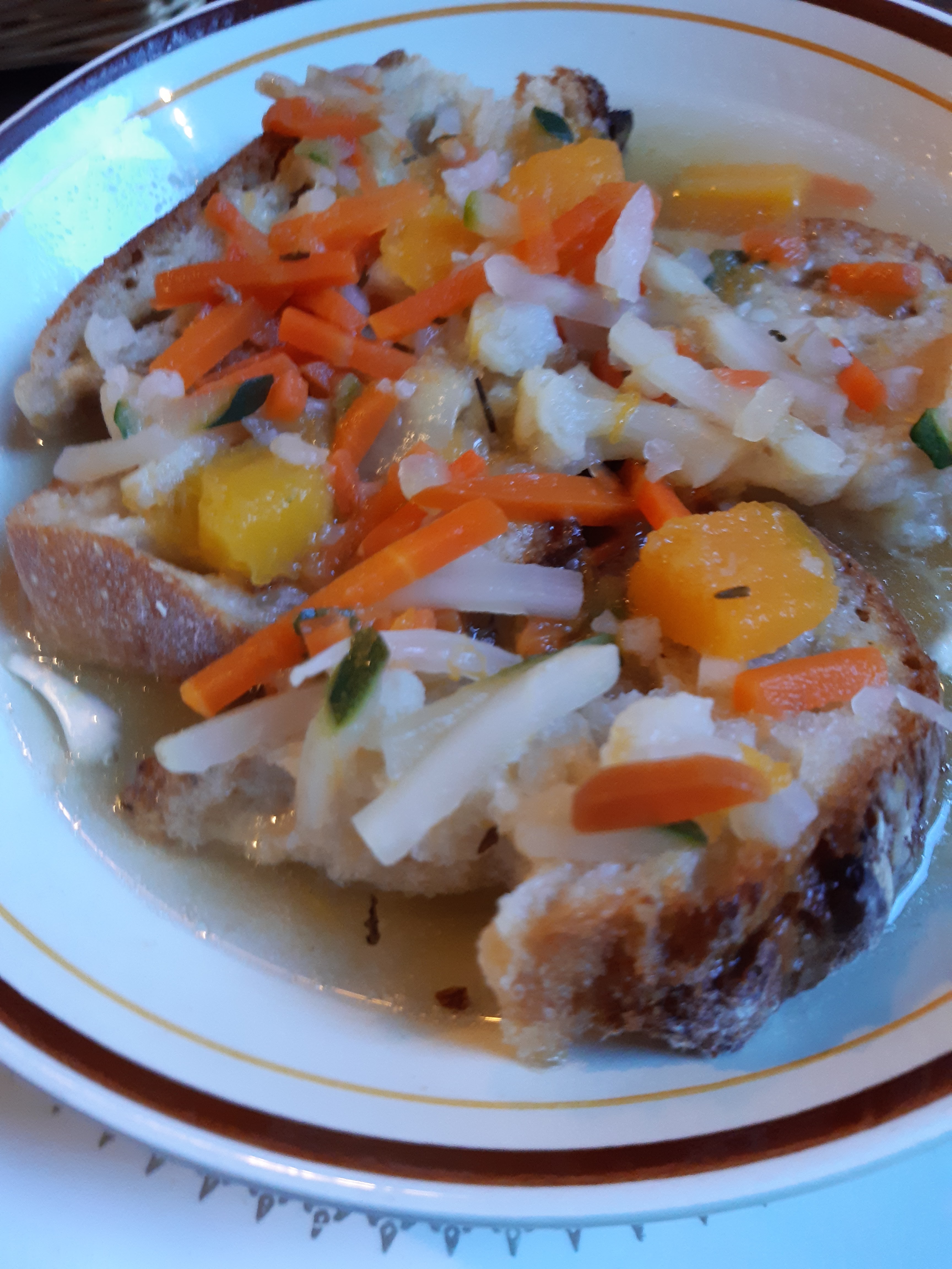Trés accueillant repas du jamais vu servi dans de l'ancienne vaisselle comme chez mémé fleur à déguster soupe à l'ortie à refaire