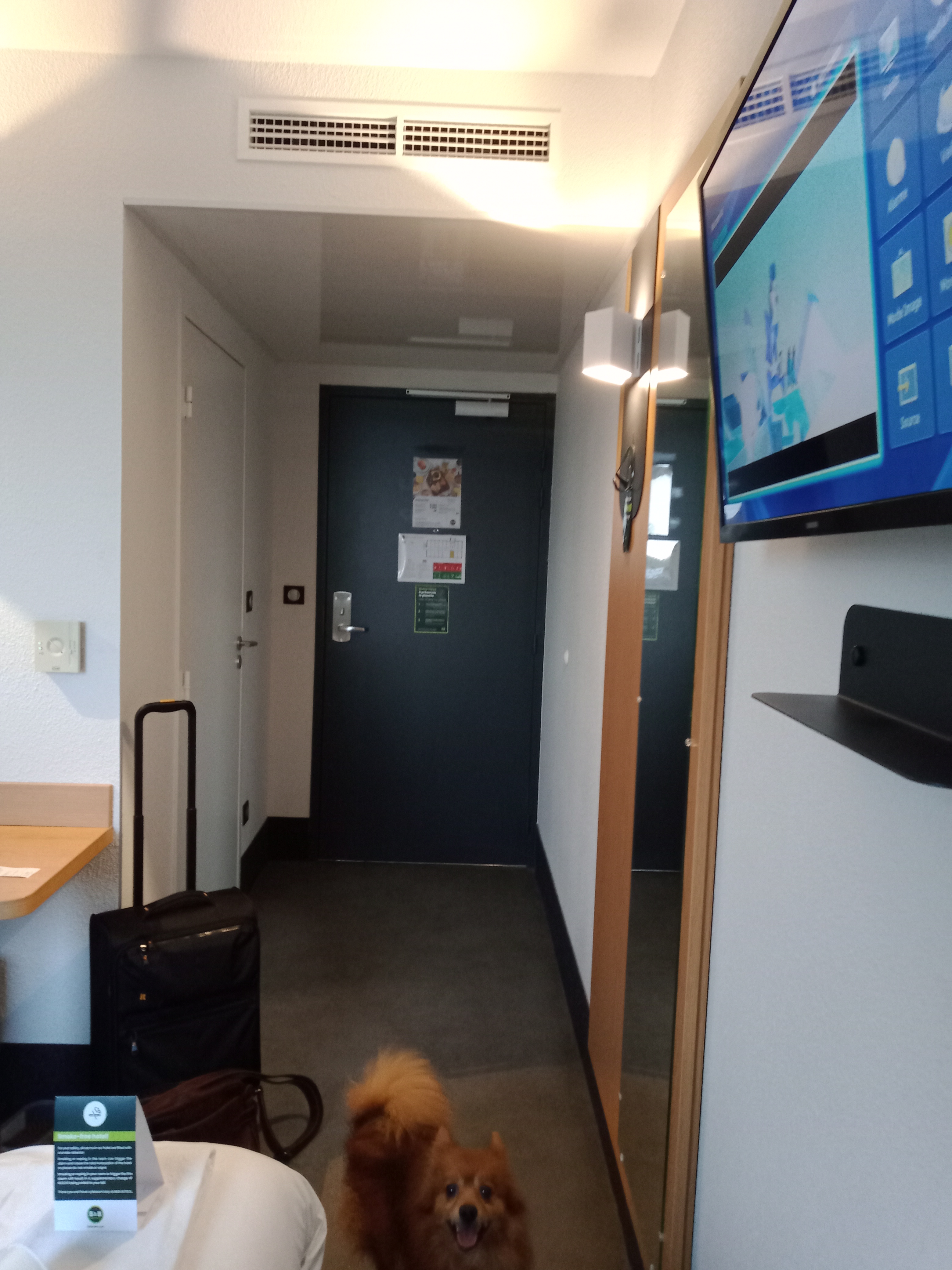 L’hôtel est très beau, simple d’accès, propre et cela donne envie de venir. Les accès au chambre sont top avec l’ascenseur. Petite salle en bas très sympa, machines à disposition, rien à dire. Une fois dans la chambre je constate bien la propreté des lieux. Même des parties communes. RAS là aussi. La salle de bain est très bien. Simple et efficace, et la taille suffit amplement. Un petit coin bureau avec une chaise, grande baie vitrée, des éclairages multiples, une bonne TV. Top aussi ! Après on arrive au couchage et là malheureusement y’a des choses à reprocher. Déjà d’une part, il faisait une chaleur extrême dans la chambre. Obligé d’ouvrir la fenêtre. Et les commandes pour la ventilation n’ont pas d’indications. Le lit, qui représente le point central dans une chambre d’hôtel est fort désagréable. Un matelas fin posé sur un sommier (une simple planche en bois) = mal au dos et inconfort. La couette est lourde, ne respire pas = on se réveil complètement transpirant durant la nuit. Malgré l’hôtel qui présente très bien, on entend fortement ce qui ce passe dans le couloir et l’étage supérieur (un enfant qui tape un peu du pied dans la chambre du dessus suffit à nous réveiller). Manque d’isolation donc. Et la présence de la voie rapide à côté, malgré l’avantage de l’accessibilité, donne quand même le désavantage de s’entendre selon le trafic. Le prix est bon, mais j’ai passé meilleur nuit chez un concurrent moins cher, rien que pour l’aspect literie.