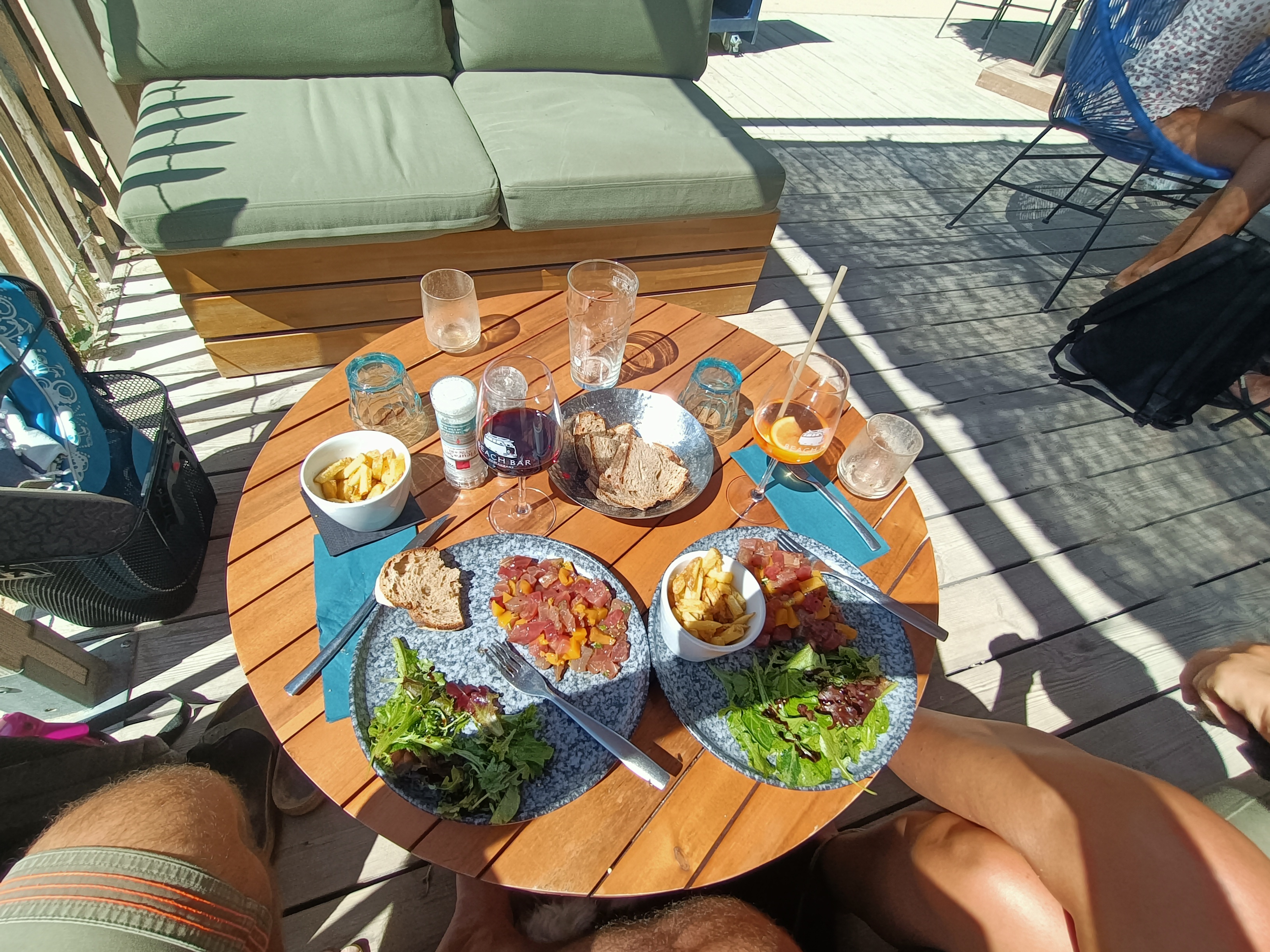 C'est bon, en terrasse avec le sable et les pins, même si on ne voit pas la mer, l'expérience est très sympa. Expérience un peu ternie par la facture aussi salée que l'océan. On paye cher l'emplacement quand même. 175€ à 6, dont 2 enfants, un apéro et une bouteille. On le fait une fois...