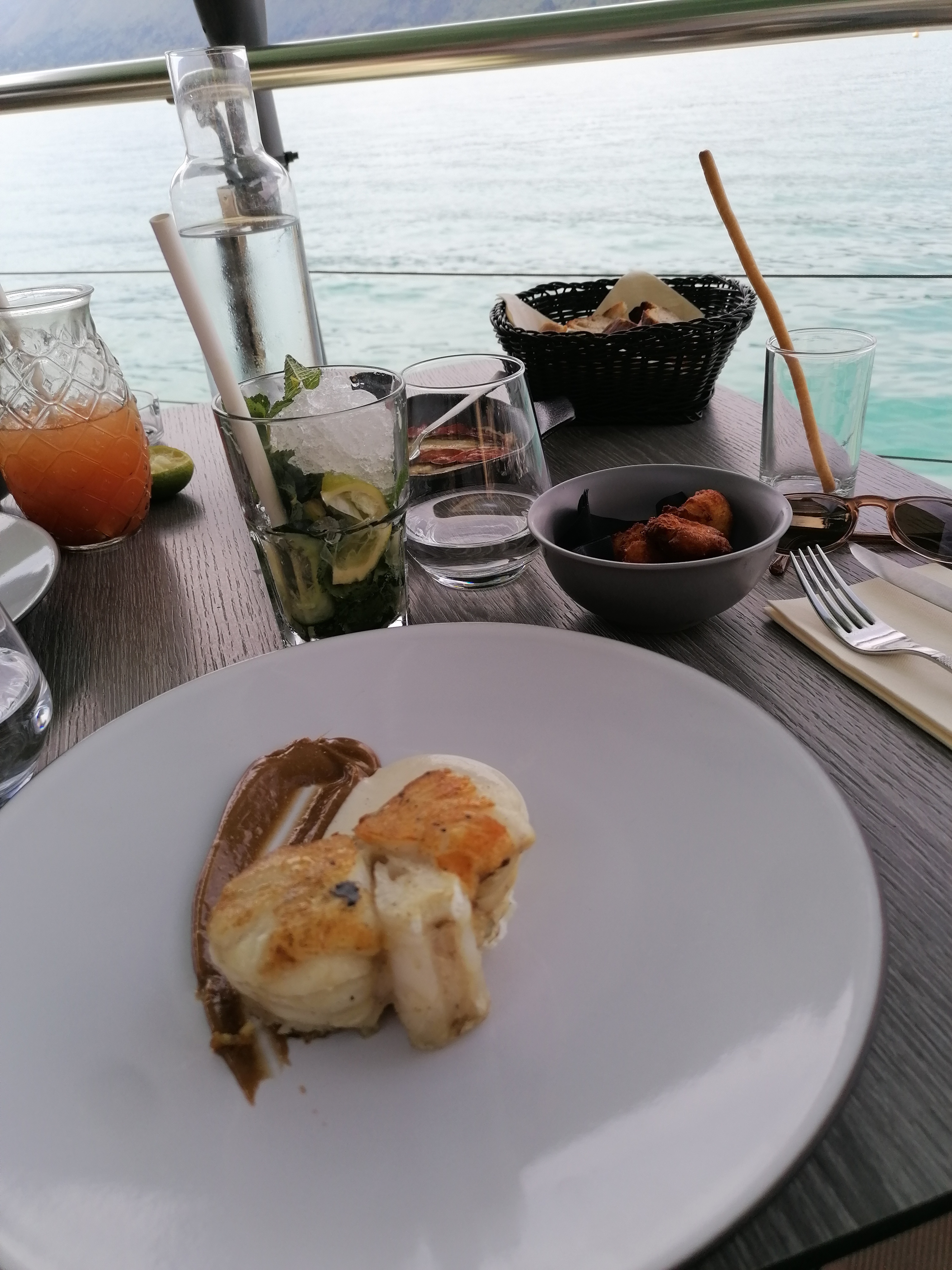 Le gros point fort du restaurant est clairement la vue, à ras de l'eau au bord du lac cela vaut vraiment le détour au coucher du soleil. Les cocktails ainsi que la nourriture étaient bons, et la quantité suffisante pour moi. Les tarifs sont assez élevés. Le personnel est sympathique, mais pourrait être un peu plus professionnel : verres d'apéro pas débarrassés, longue attente pour les entrées puis on nous amène les plats alors que les entrées ne sont pas terminées. Ensuite attente encore assez longue pour le dessert. Globalement une bonne expérience tout de même !
