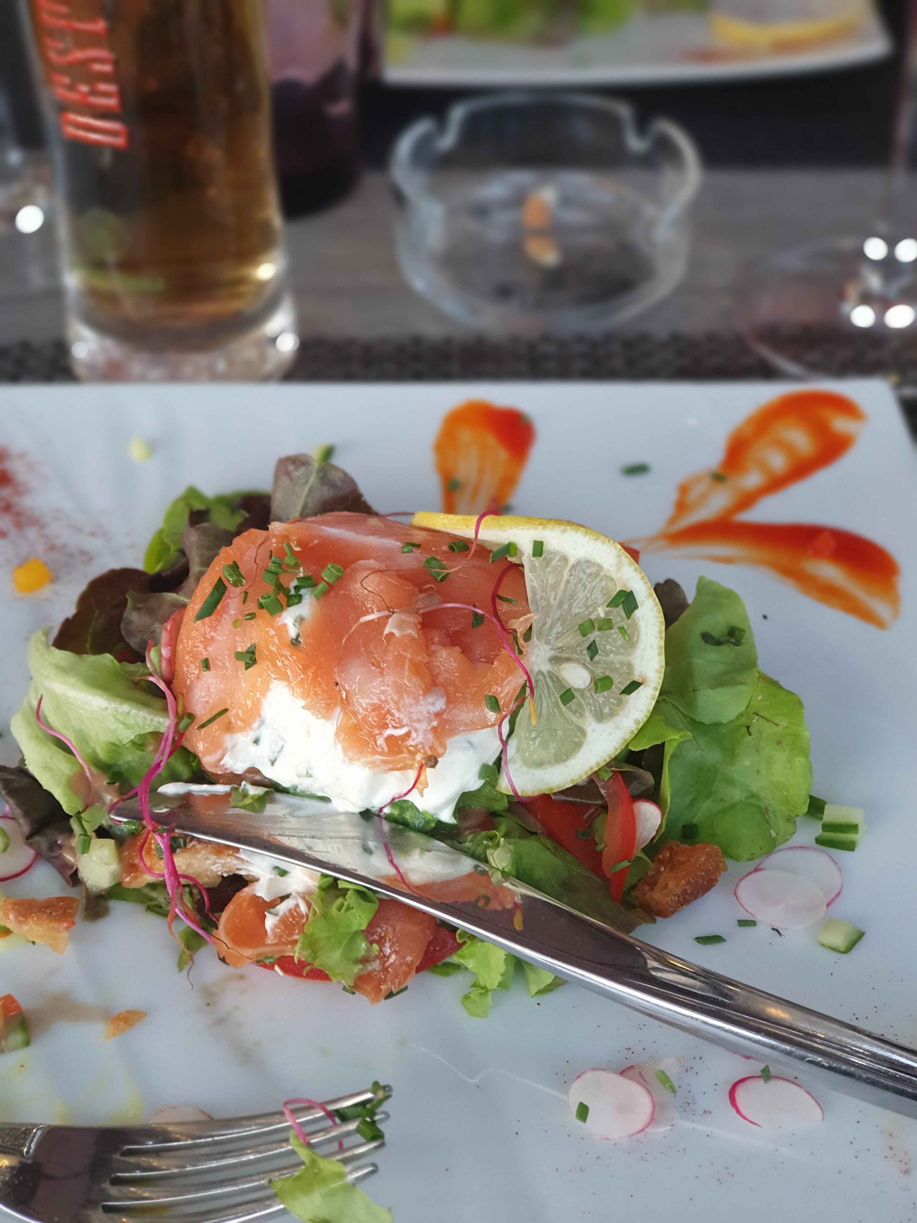Très belles assiettes, accueil agréable par un serveur très pro , peu cher à mon goût, produits frais Seul bémol, serveuse peu souriante, limite agréable