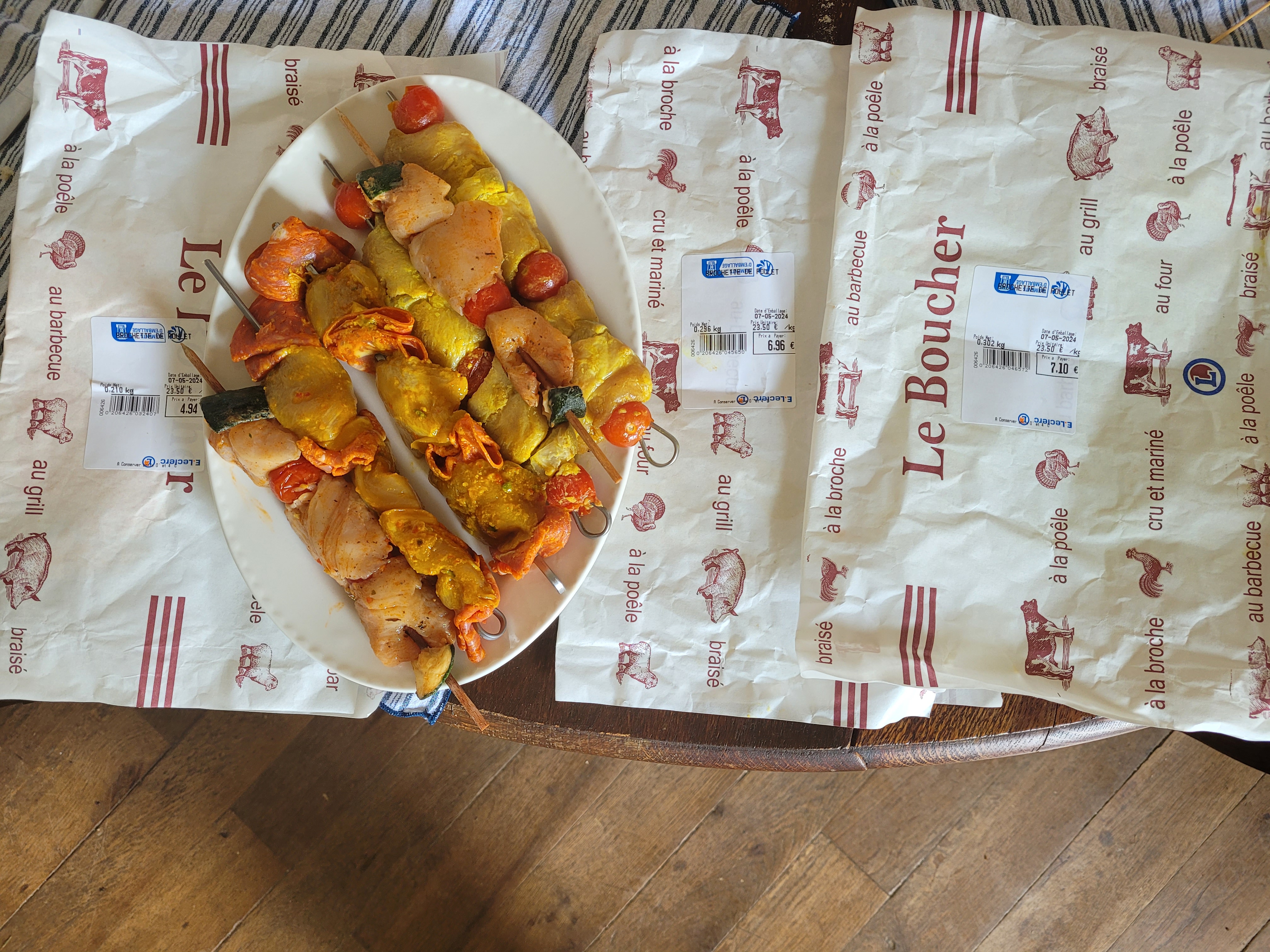 7 mai 2024 : La boucherie Leclerc Azay fait payer les brochettes de poulet au moins 40 % plus cher en utilisant des piques en acier lourd plutôt que des piques en bois = à 23,50 euros le kilo c'est très très cher et lorsque l'on trompe le Client celà a un nom : voir les photos en pj (attention les brochettes sont enregistrées en caisse sous caille farci) = personne chez Leclerc Azay n a pour l instant jugé utile de nous répondre correctement lorsque nous leur avons fait remarquer leur ... erreur que l'on pourrait qualifier d'arnaque voire pire