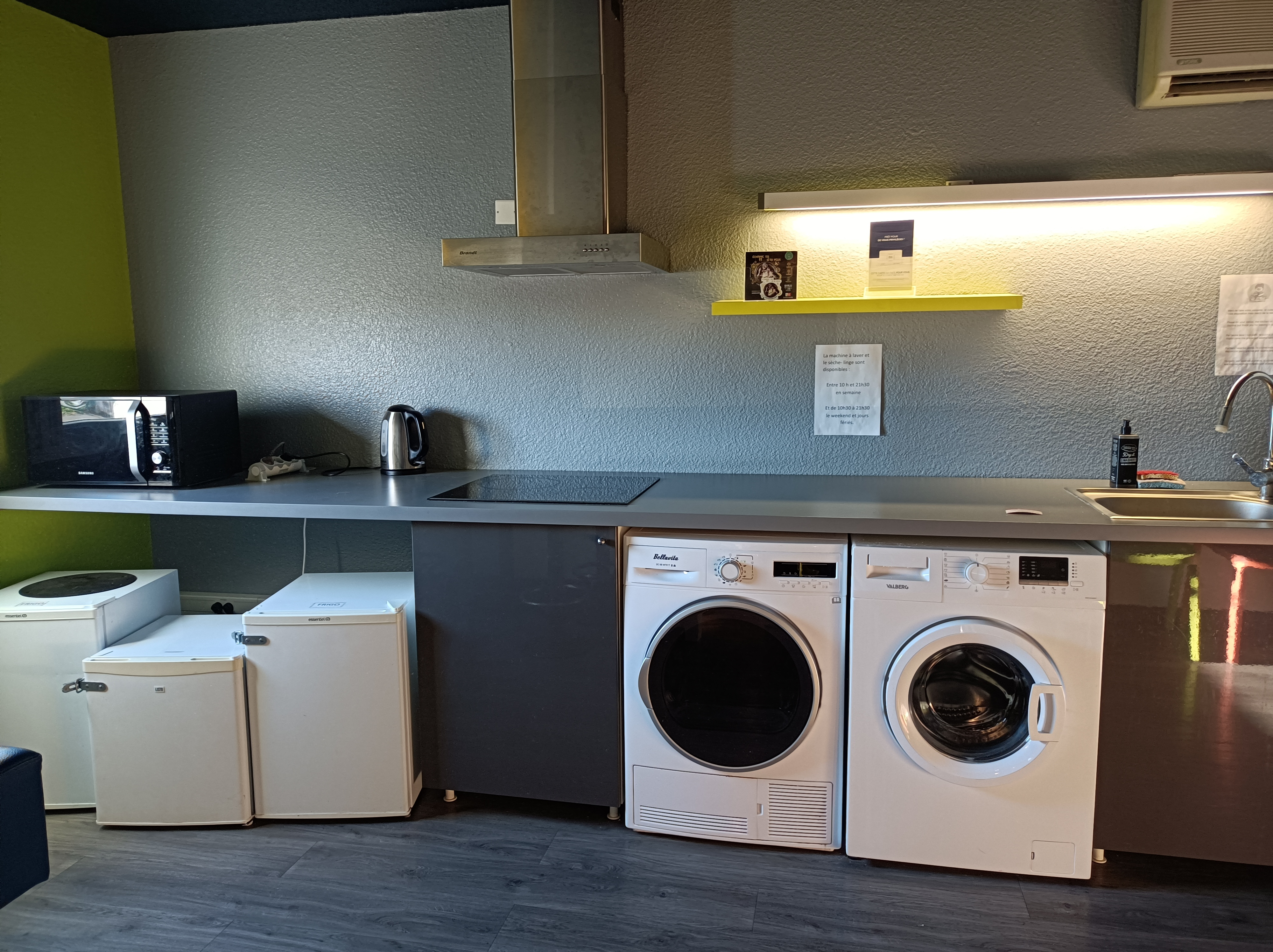 Les réceptionnistes sont très souriantes et accueillantes. Il est très pratique d'avoir une cuisine commune à disposition, cela permet d'économiser sur les frais de restaurant. Un super u à environ 15-20 mn à pied. Machine à laver le linge (5euros) et table et fer a repasser également disponibles. Localisation parfaite si vous venez au Vendeespace. En revanche, puisqu'on est dans la zone industrielle, c'est beaucoup plus éloigné du centre ville et, sauf à avoir une voiture, on est alors tributaire du réseau de bus (ne circule pas le dimanche et il faut vraiment faire correspondre ses horaires qui ne sont pas toujours fréquents). La literie est bonne et le petit déjeuner varié. En revanche, bémol sur la propreté, notamment les sols, les joints de douche jaunes.