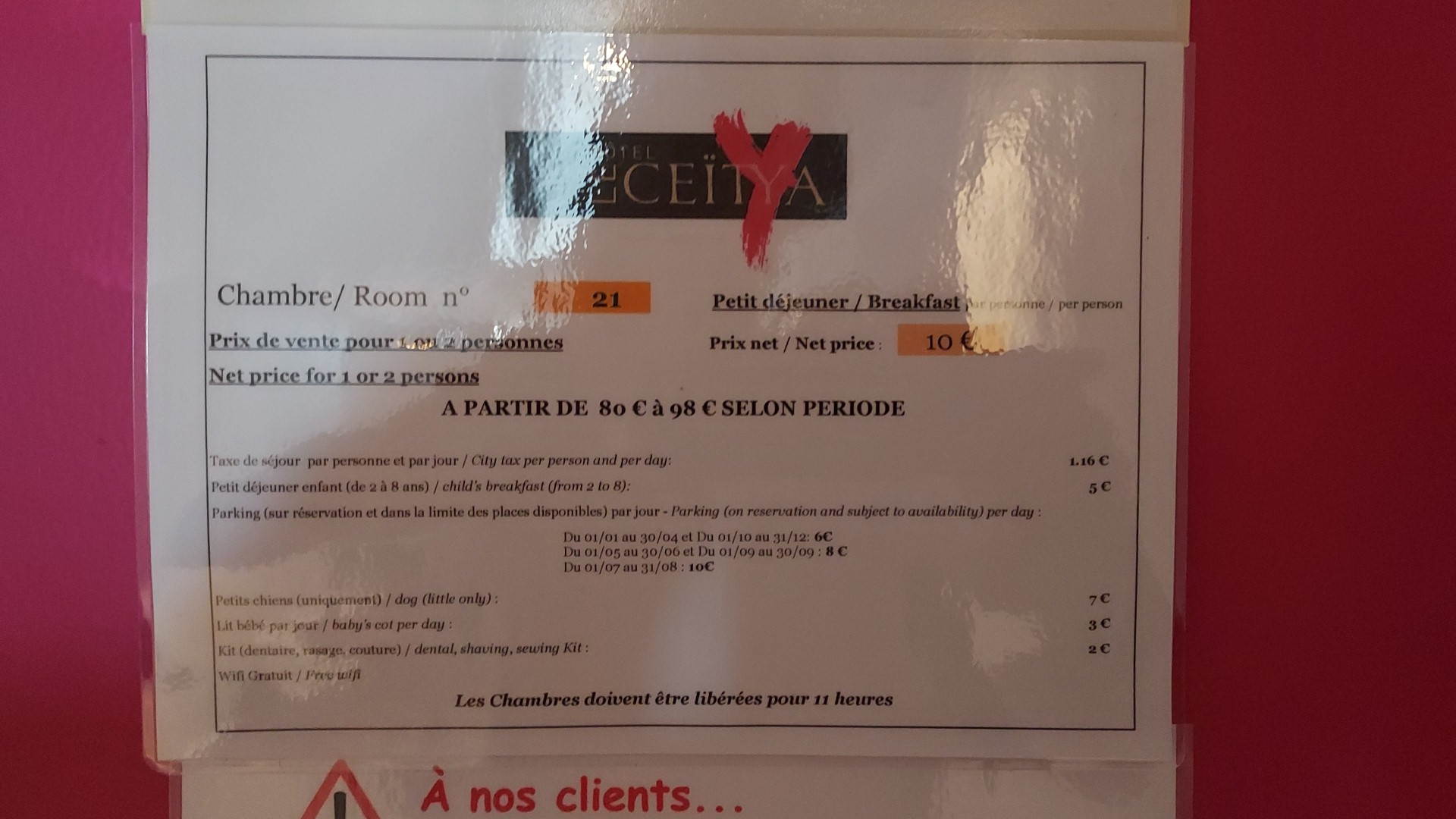 Nous avons séjourné une nuit à l’hôtel de la ceitya, arrivée tardive, la réception était donc fermée mais nous avons eu toutes les indications par téléphone (très bien expliqué). Chambres simple et propre. Possibilité de garer sa voiture (en supplément) sur parking privé. Pdj servi à table, formule simplifiée mais suffisante (du au covid). Check out en douceur. Une belle équipe agréable. Pas de surprise pour la note car confirmation par e-mail lors de la réservation avec la description des tarifs.