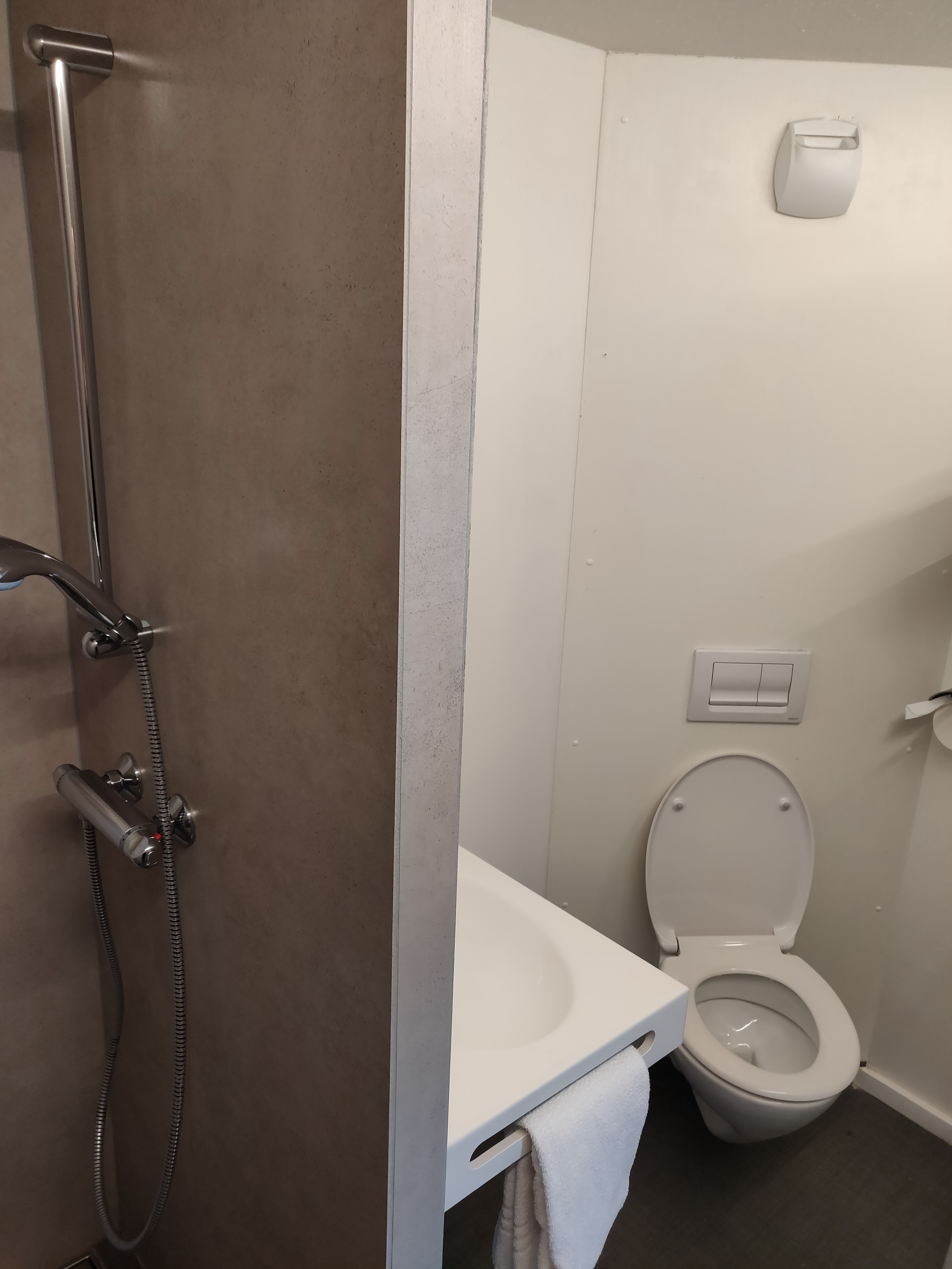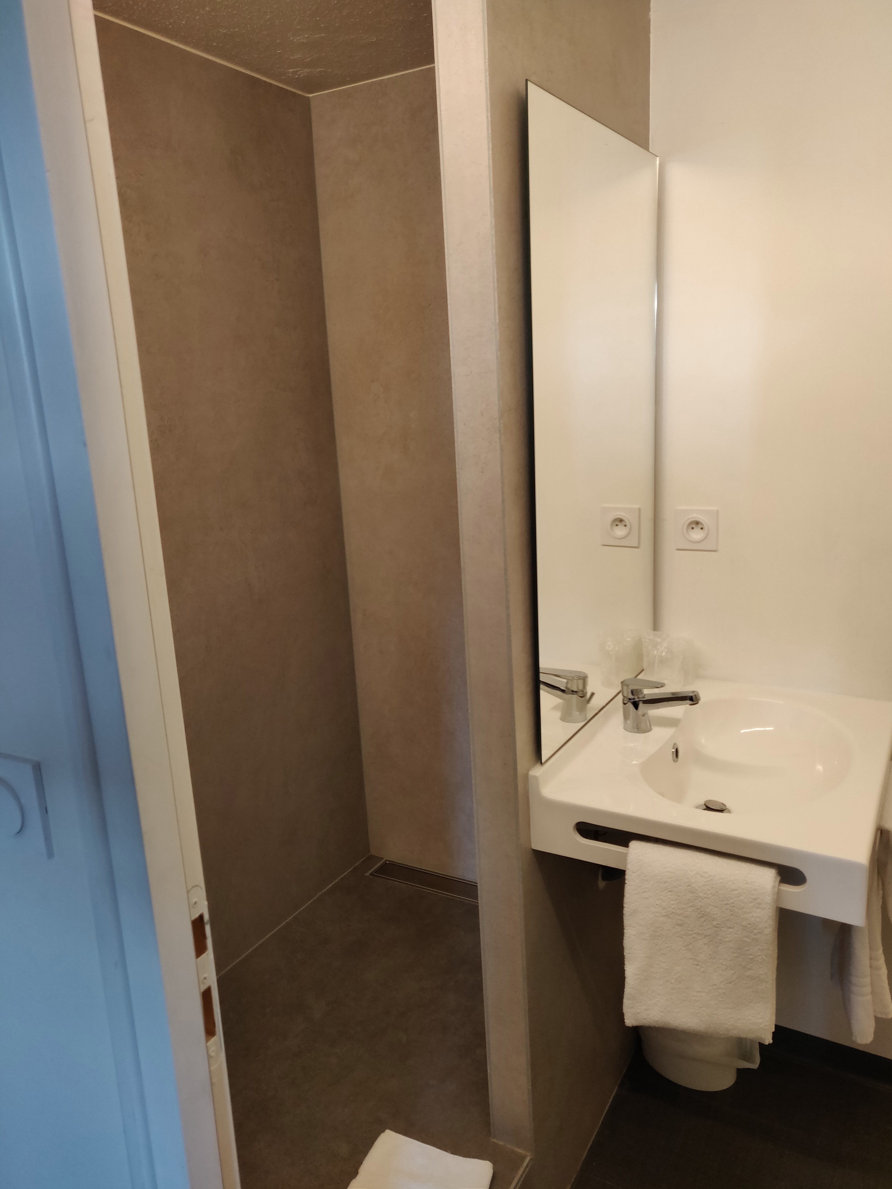 Chambre avec douche, séparée et spacieuse, ce qui pour cette chaîne d’hôtel est exceptionnel!!! Accueil personnalisé et H 24 là aussi c’est exceptionnel pour ce type d’hôtel Bravo