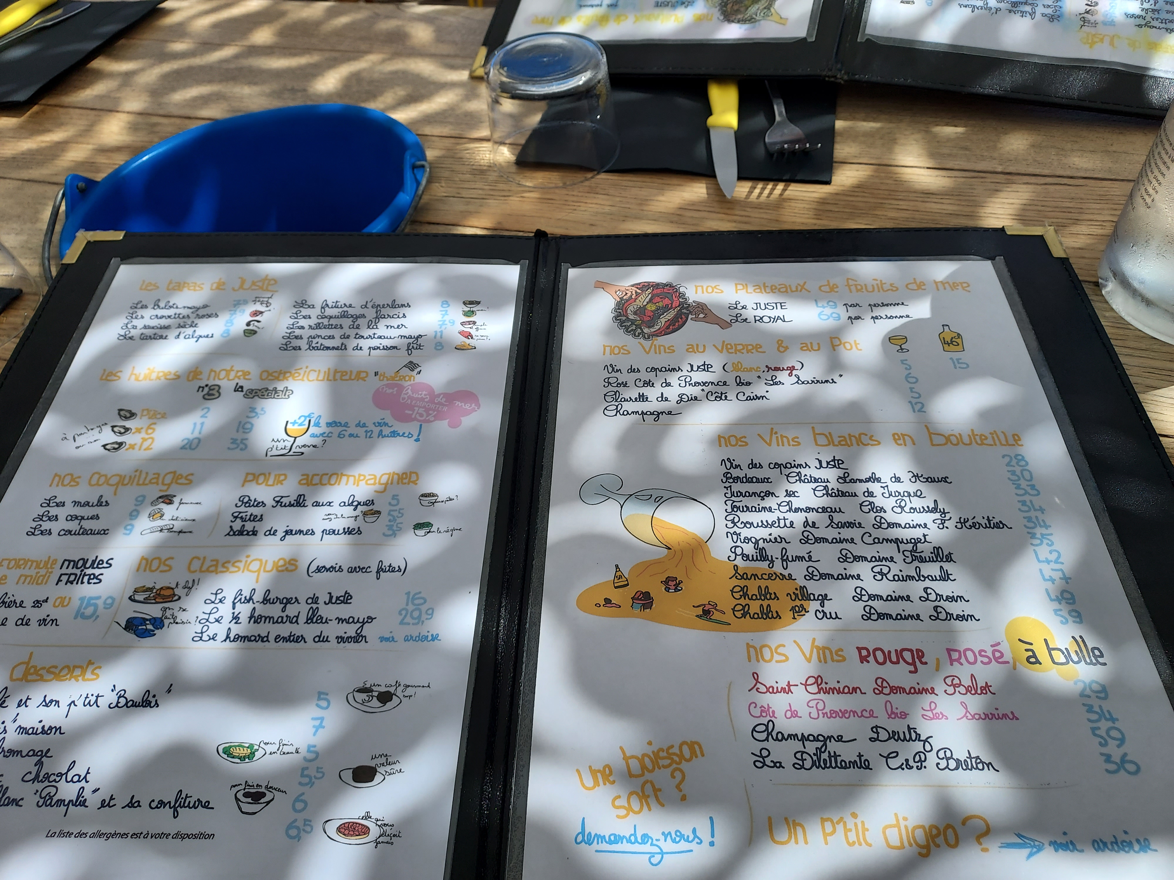 Tous les ans ,un de nos plaisirs est de venir manger dans ce lieu atypique. Cette année je n ai pas dérogé à la règle ..et pourtant cela ne s est pas passée comme dans mes souvenirs ..bref sans rentrer dans les details ..votre carte est très sympa et les couteaux avec les pâtes fusilli j en rêvais ! Do c j aurais juste un conseil : prenez une personne de plus afin d éviter le coup de jus au cuisinier ( qui est seul) et éviter de dire aux clients qu ils n ont pas compris que vous serviez tout en même temps tapas et plat ( et pourquoi pas le dessert aussi ? ) pour justifier une erreur d organisation. Ce qui peut arriver évidement mais prendre le touriste pour un con jeune fille ce n est pas pro ! Résultat, moules réchauffée( voir photo,)et frites froides .couteau et pâtes froides ..quel dommage .j ai tout de même payé casi 60€ ..pour 2 Votre collègue ,bien sympa,m à offert mon. Café..