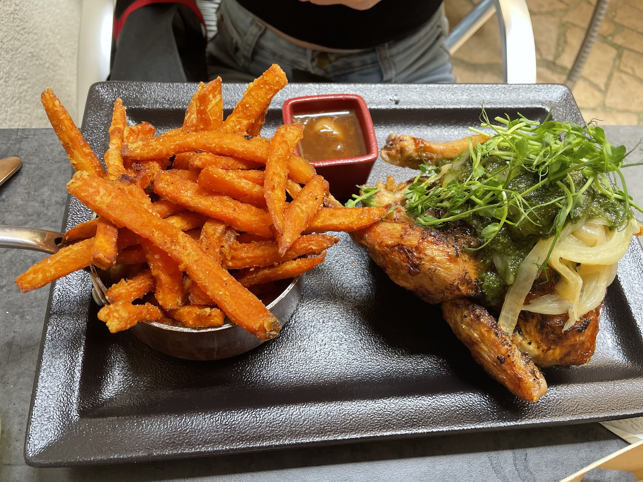 À Annecy dans la rue sainte Saint Claire nous avons eu un accueil chaleureux et convivial, une table agréable dans une toute petite cour. Le repas était délicieux de qualité avec d'excellentes sauces. J'ai beaucoup aime le porc 🐷 francomtois avec une béarnaise, rôti avec des pommes et des poires accompagné de pommes de terre rôties sauce au vin. Mon épouse à choisi un 🐓 coquelet rôti au tomates confites. Le dessert était une crème brûlée au spéculoos et au chocolat 🍫. Très bonne adresse. À recommander