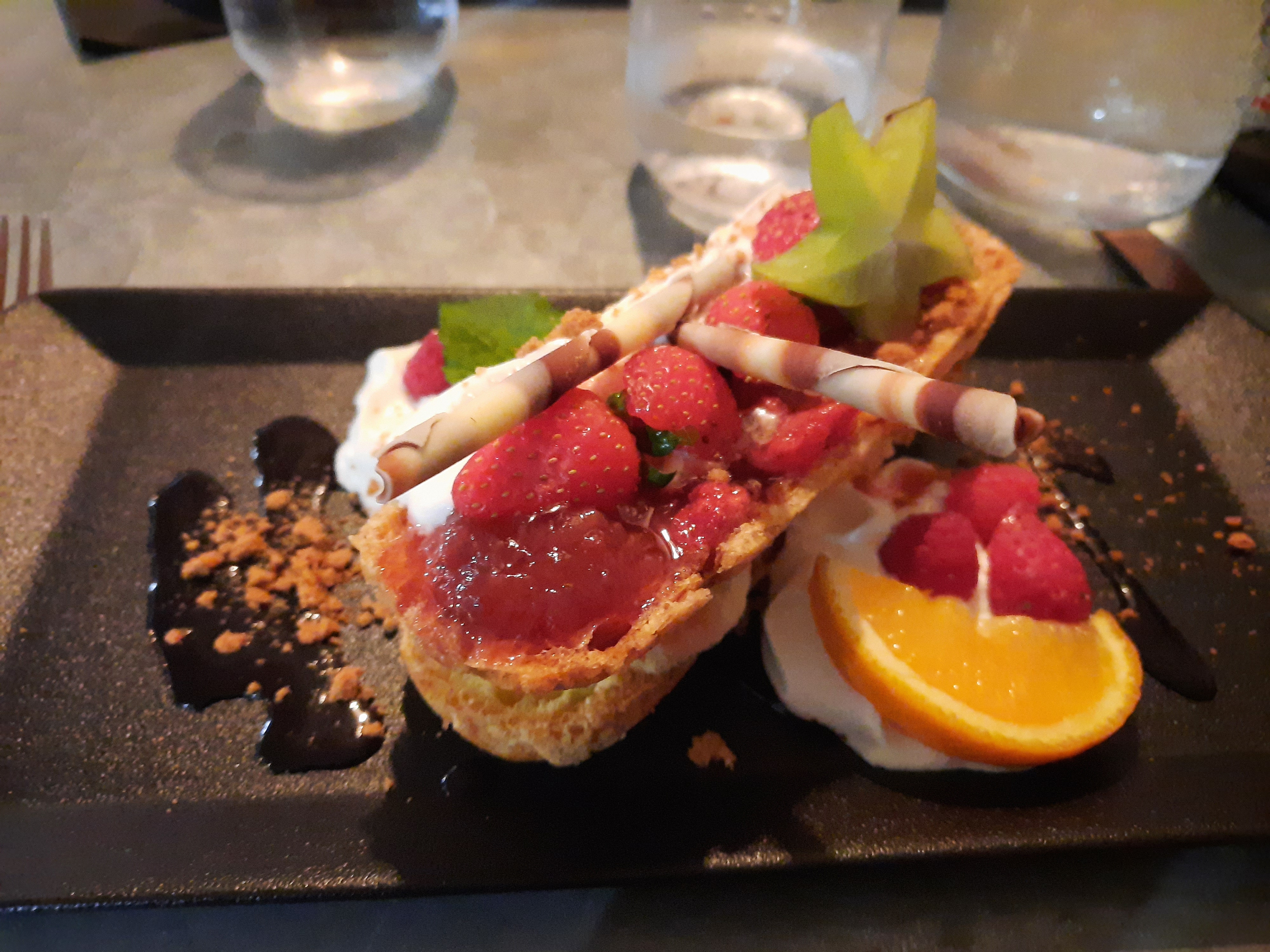 En commençant par l'accueil sympa de Melanie nous avons un excellent diner avec une bonne recommendation de vin rouge adapté. Le souris d'agneau façon tajine aux citrons confits, miel et amandes avêc pommes de terres rôties était merveilleux. Le baba au rhum compotée de fruits rouges et glace vanille était un excellente dessert. Nous reviendros avec plaisir!