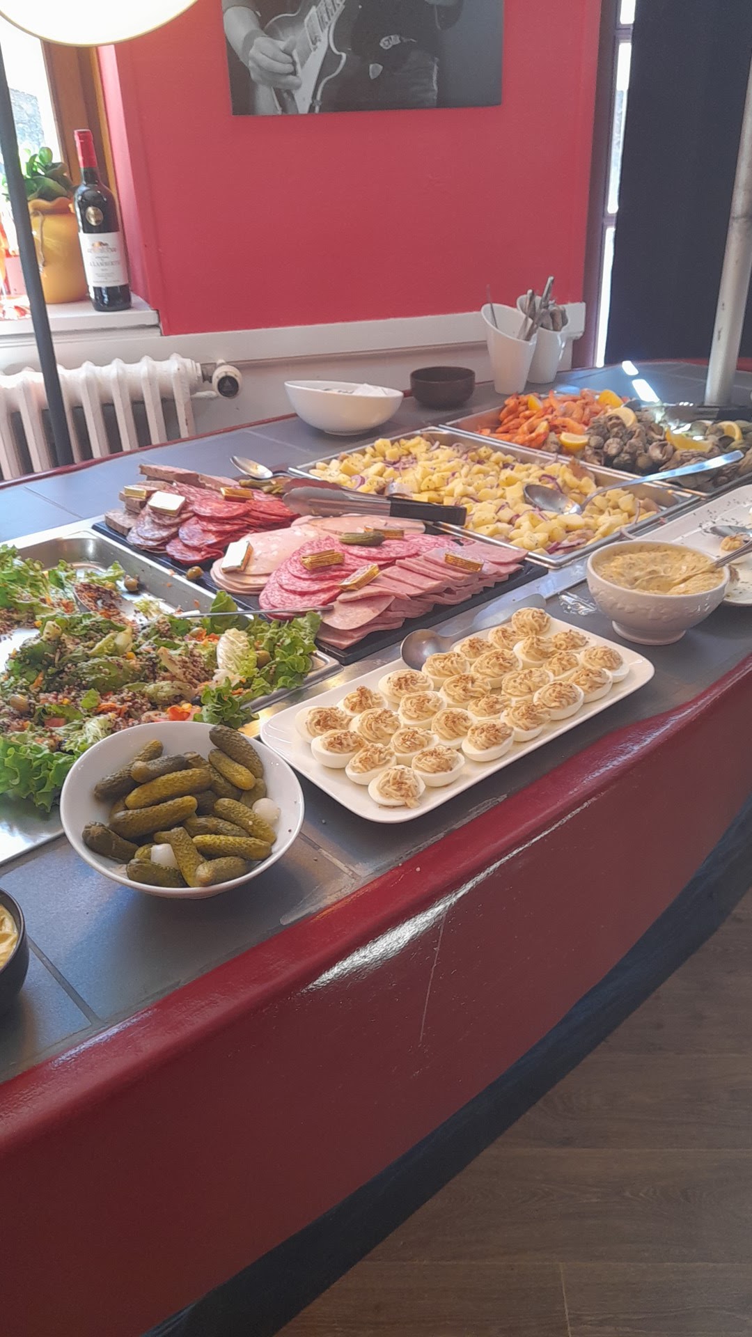 Dommage qu'il n'y ai pas de desserts mais c'est Vraiment un buffet excellent 👍🏻 Ambiance rock a l'image des portraits de stars sur les murs, Cobain, Winehouse, Clapton, Morrison, Hendrix ... Bravo au chef !