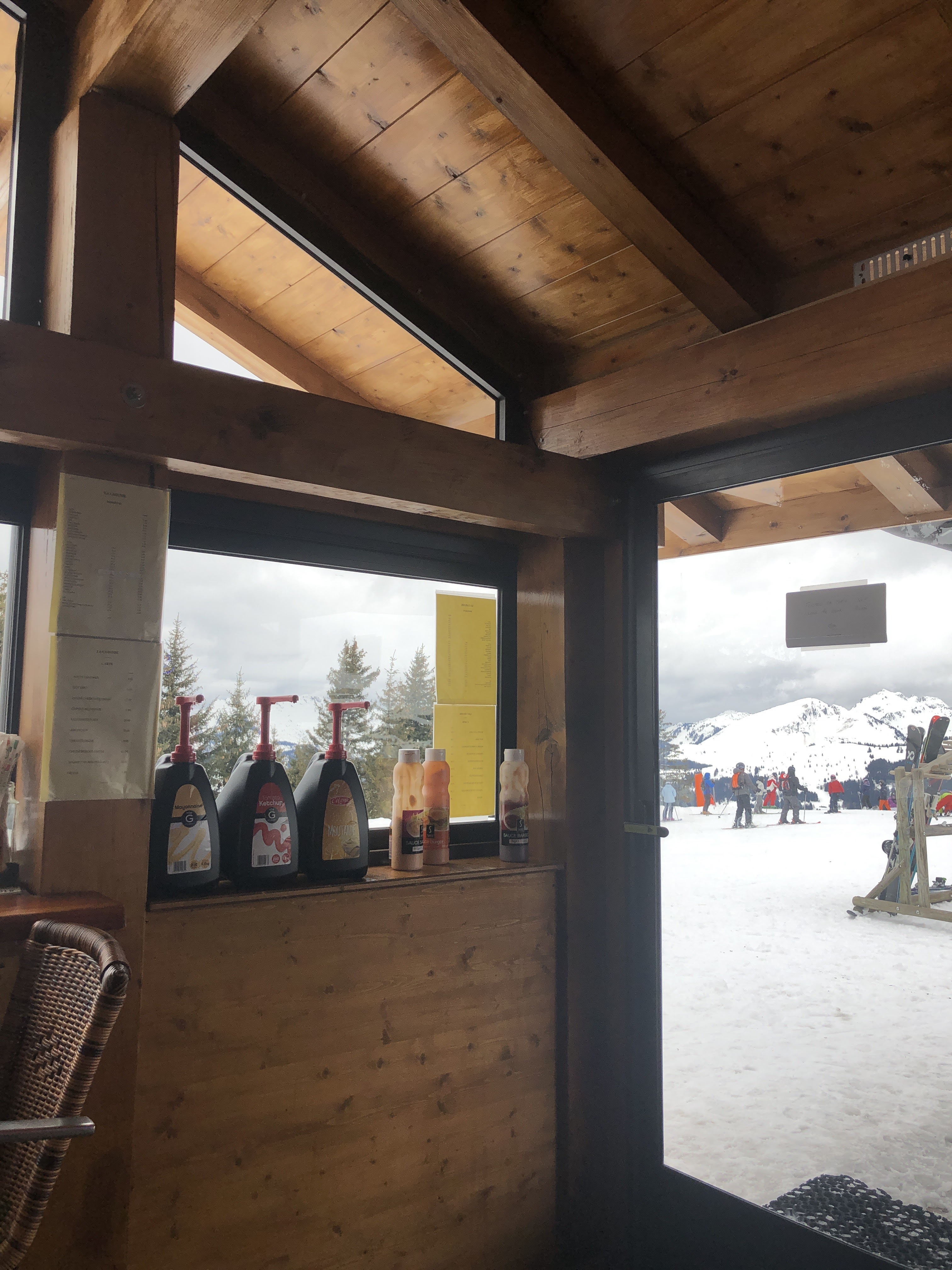 54€ pour 2 tartelettes aux myrtilles à peine décongelés, 2 verres de mousseux très moyen, un cheeseburger rachitique et une saucisse frite esseulée. (+2 cocas zéro…) + : la vue (mais chère ) - : le repas Bon ski