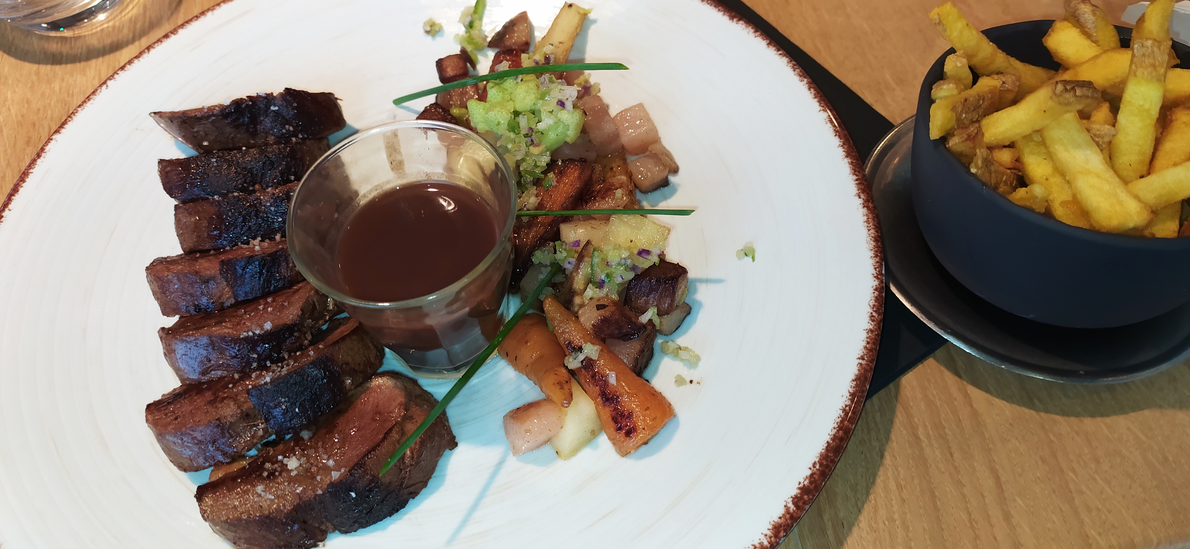 Mélange de légumes exquis, parfaitement cuits, légèrement croquants et dont le chef fait bien remonter les saveurs. Viande exceptionnelle dans une ambiance sobre, chaleureuse et sans prétention.