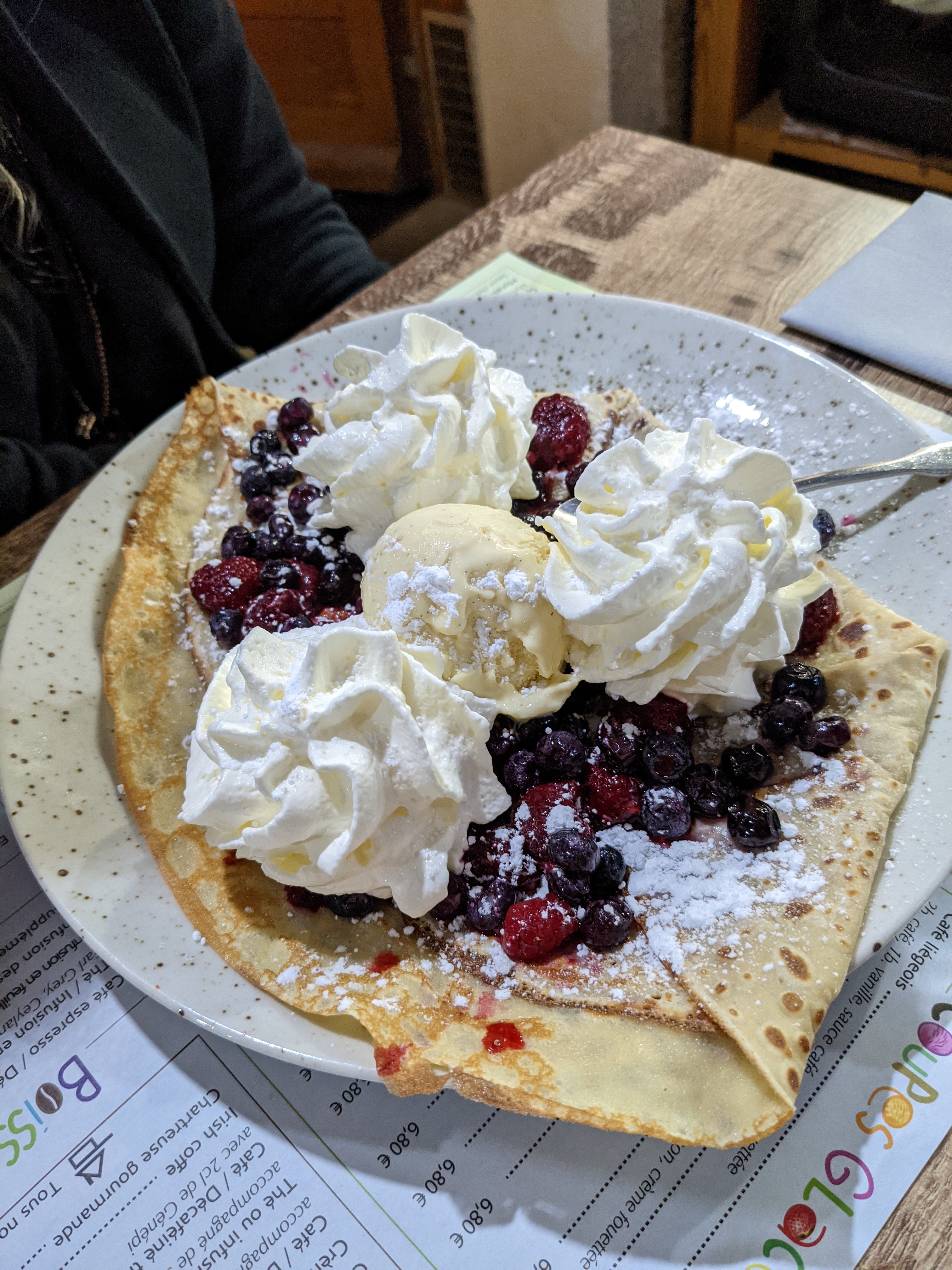 Meilleure expérience que j’ai fait depuis que je mange des crêpes 🥞 et chocolat italien juste parfait du vrai chocolat chaud, crêpes très bonnes et prix correct. Personne très agréable. Je recommande et l’endroit est très sympa avec terrasse, il y a un ruisseau juste à côté aussi ( a 200m)