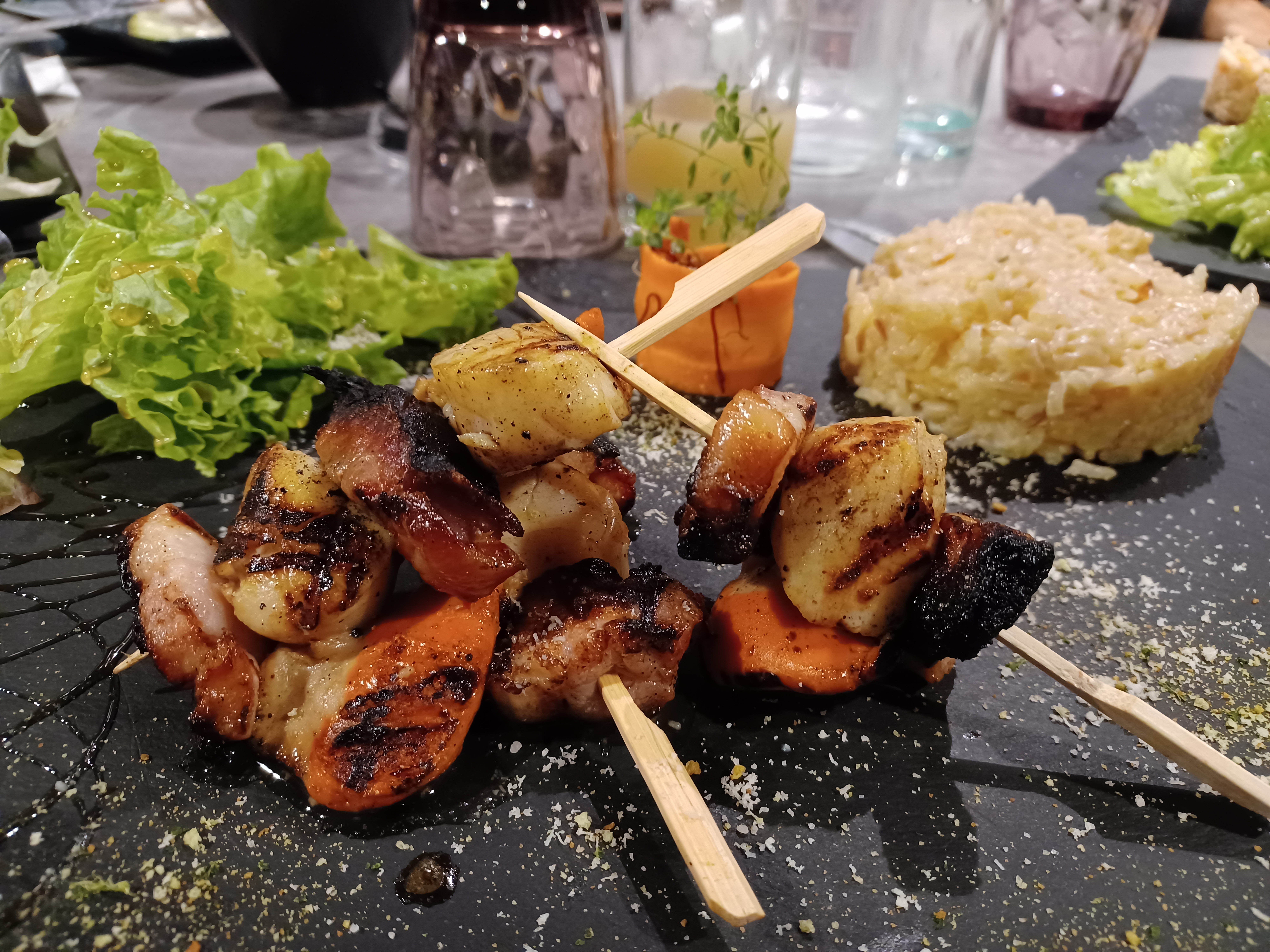 Suis venu ici sur invitation... Je me suis laissé tenter par les Brochettes Lardons Noix de St-Jacques... Mélange subtile, mais les lardons étaient bien trop grillés d'un côté, le feu les avait transformé en charbon. Malgré celà, je me suis délecté. C'est une enseigne que je recommande vivement , ne serais-ce que pour vous faire votre propre idée !