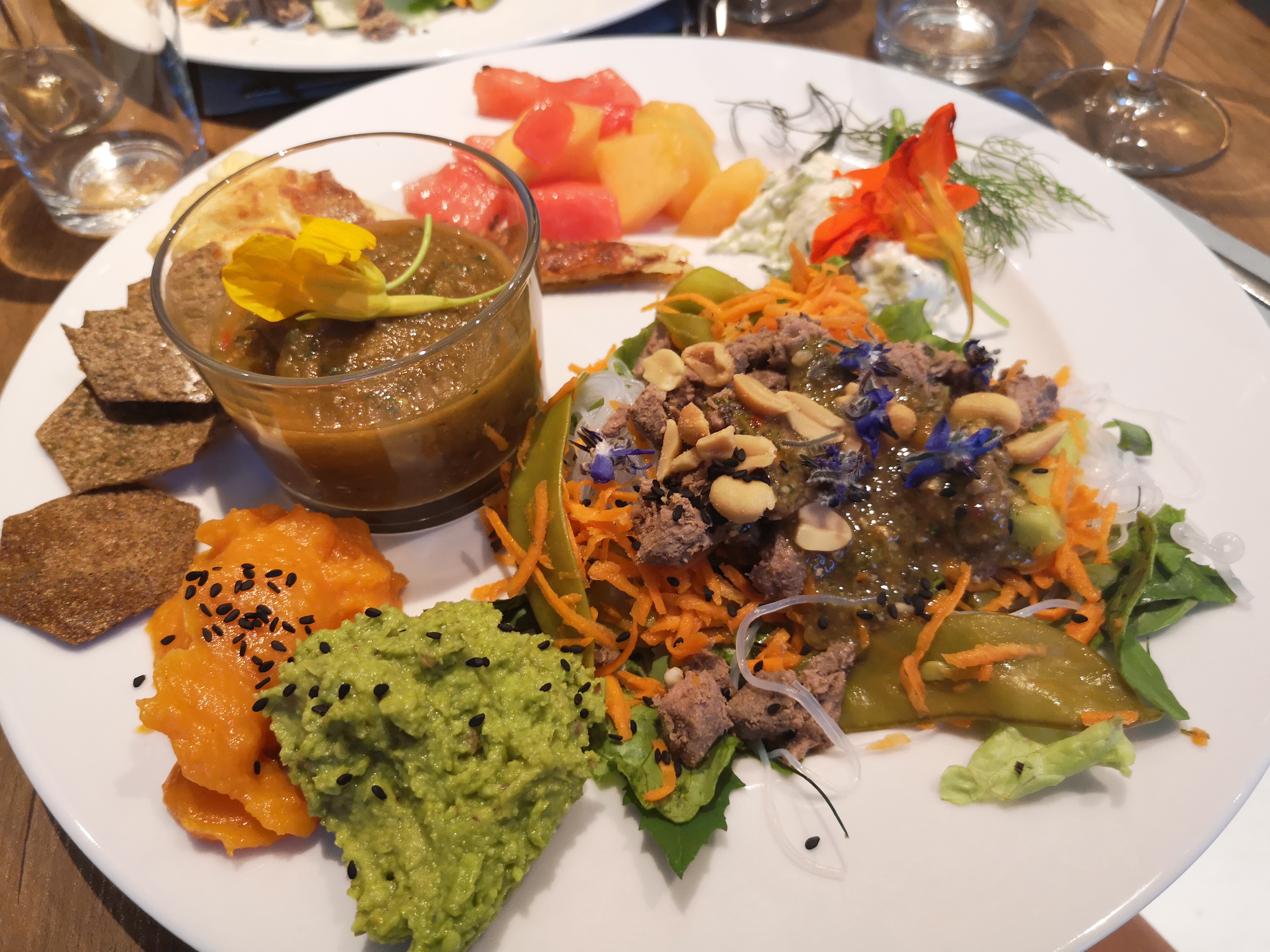 Super endroit pour une cuisine originale, découverte florale dans l assiette. Assaisonnements et associations d ingrédients goutus et savoureux. Possibilité vege/ sans gluten. 1 assiette avec farandole de mets colorés et beaucoup de saveurs, chauds et froids à déguster dans l ordre. Accueil très sympathique et souriant. C est toujours un super moment passé seul, en couple ou avec les enfants (espace jeux prévu pour eux top!) Forcément tout est fait maison! Je recommande