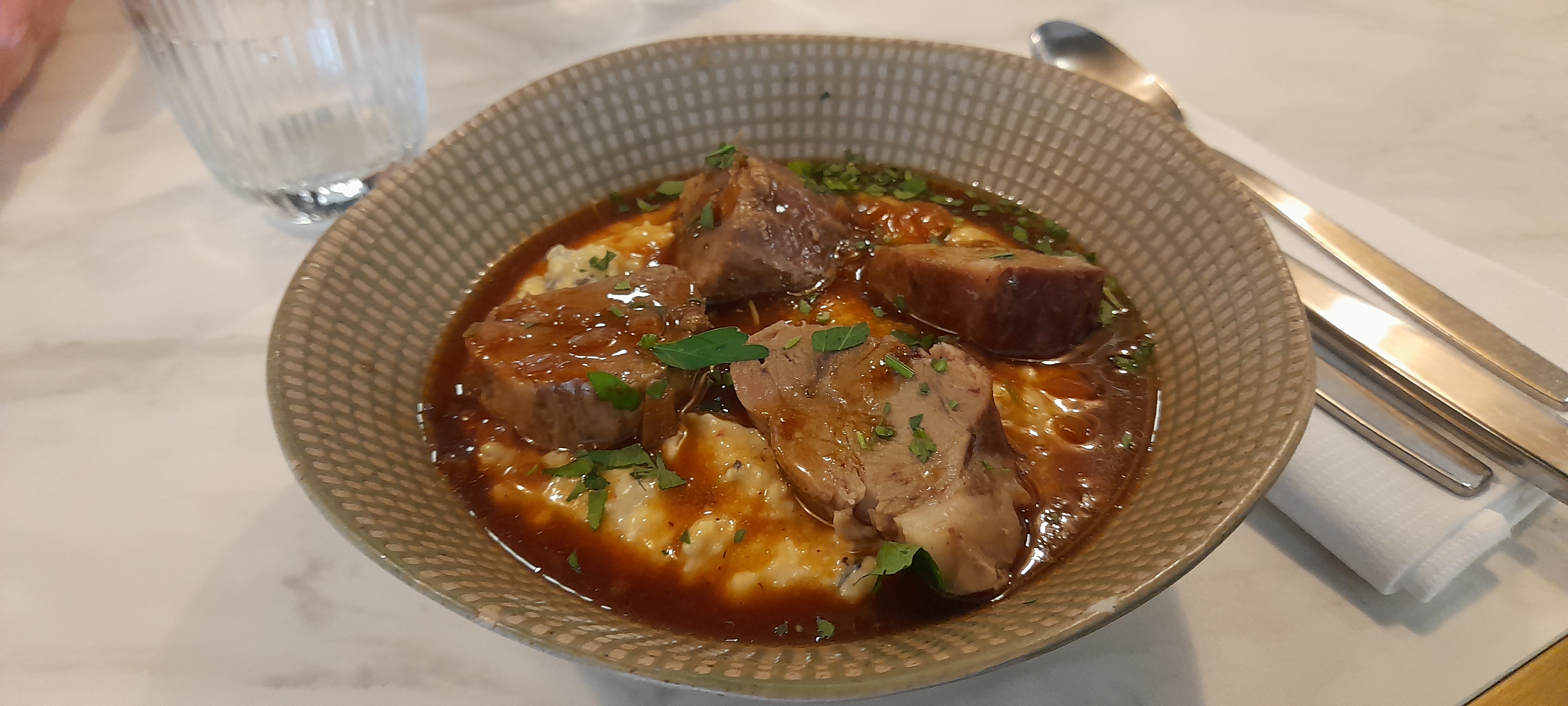 Déjeuner d’affaIres ce jeudi, franchement ravie, j’ai déjeuné d’un risotto de lentilles au haddock, vraiment goûteux, et le dessert , un délice, une pomme cuite en tatin, biscuit spéculos maison, une petite crème ( mousseline ?), le tout enrobé d’un caramel, un vrai bonheur, merci 🙏 et service impeccable pourtant beaucoup de monde. Vraiment ravie
