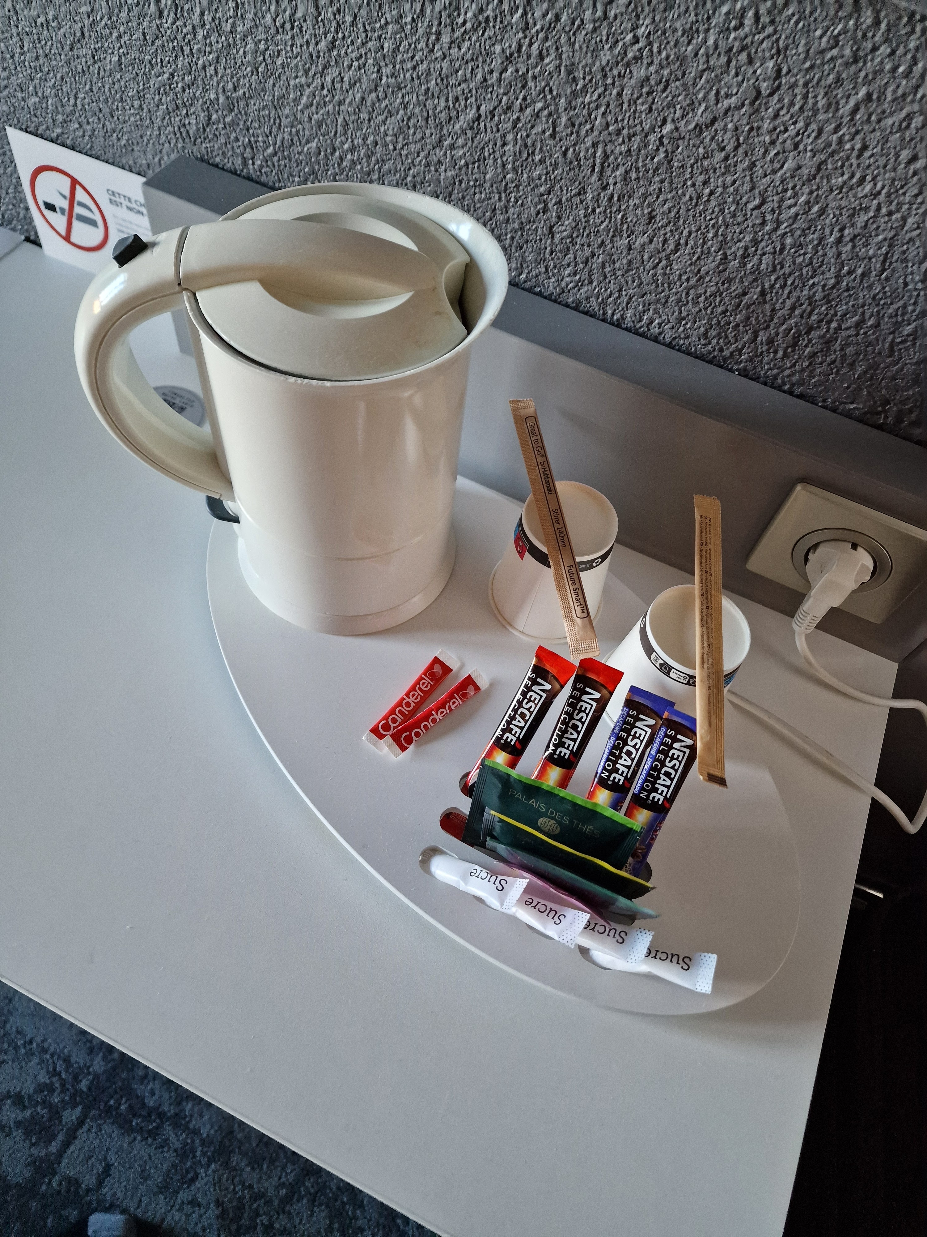 Nous y avons séjourné une nuit en pensant monter de gamme d'hôtel par rapport à nos habitudes d'hôtels d'indépendants. Et ça n'a pas été le cas ! Loin de là. On est souvent plus déçu par les soit disant haut de gamme que les classiques. Certes, l'entrée et parties communes très sympathique avec le bar a eau et les moquettes dans les couloirs. Mais les chambres supérieures ne le sont pas. La salle de bain est petite, et la douche est cabine comprenant pommeau de douche, pluie et VMC. Et la chambre est très jolie, un peu plus spacieuse qu'une chambre classique. Mais pas de petite bouteille d'eau ou de soda. Et encore moins de frigo ! Ci joint la photo de l'emplacement du mini bar. On risque pas de faire des extras. Sans compter l'absence de machine a café type Nespresso, mais la présence d'une bouilloire hors d'âge, jaunit par le temps, permettant de se délecter d'un café lyophilisé comme chez Mamie. Et une lumière de tête de lit sur deux est en fonctionnement. Bref heureusement que la literie était bonne et que l'hôtel est bien placé. Mais on le conseille pas.