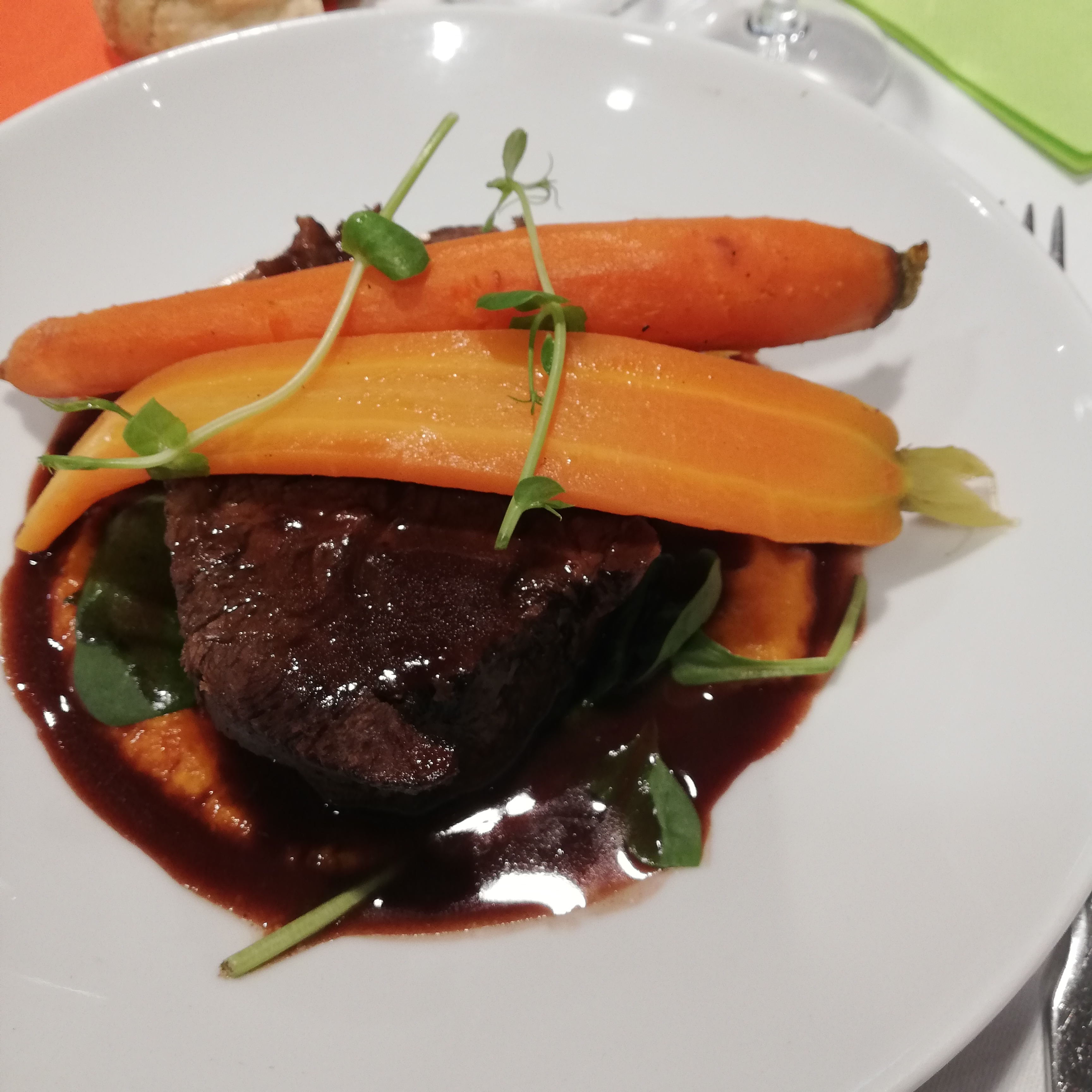 Nous avons mangé au restaurant, on a pris le formule entrée plat, avec oeuf mollet en entrée et filet de merlu en plat, délicieux. Le restaurant est propre et avec une belle deco