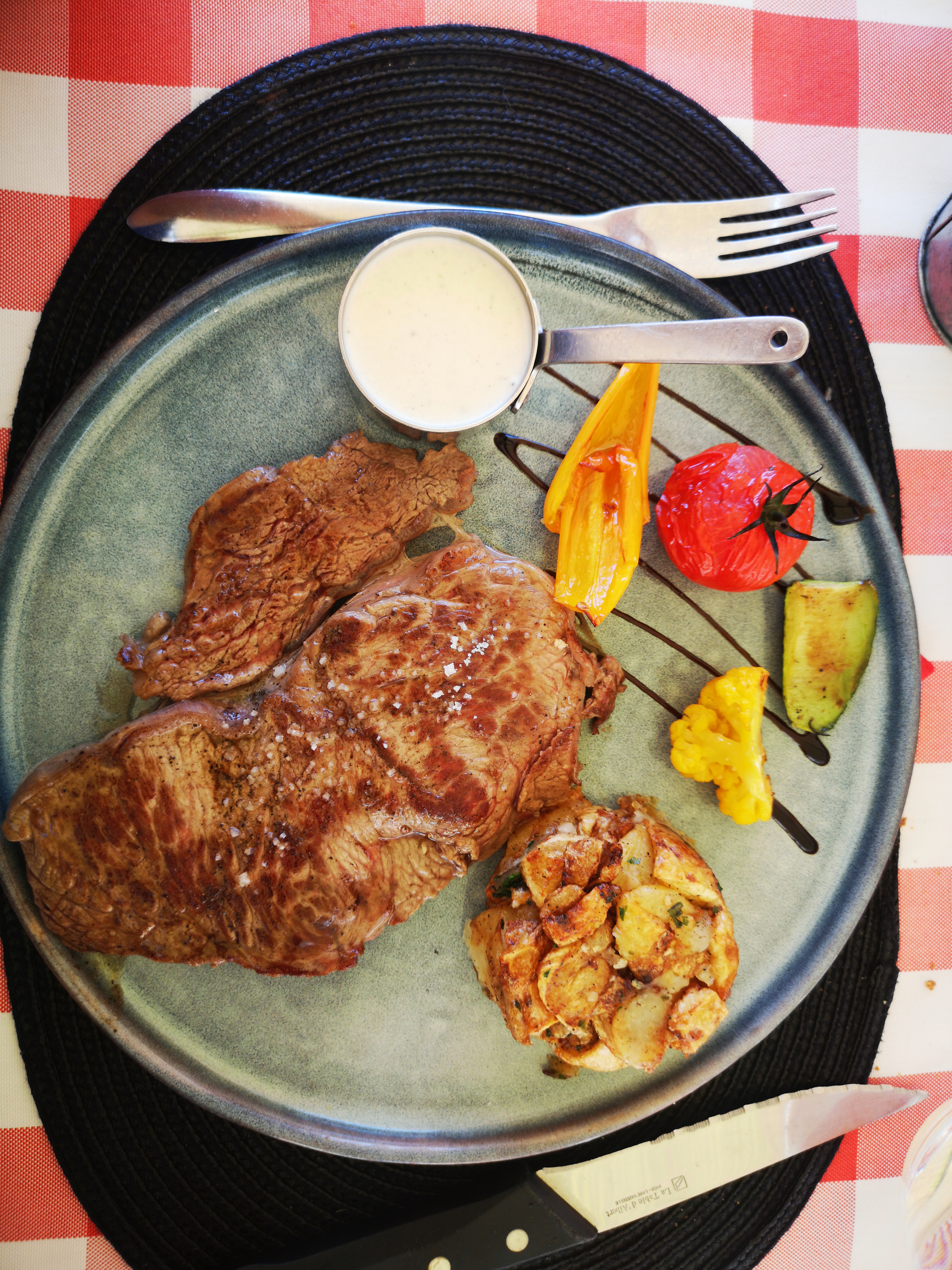 Très bon restaurant, certains avis disaient que ce n'était pas assez copieux pour nous il y en avait largement assez le tartare de saumon était assez copieux pour une entrée, l'entrecôte avait une cuisson parfaite et était vraiment tres bonne, petit changement pour le dessert, d'habitude les restaurants servent plutôt un moelleux au chocolat là c'était un gateau avec un biscuit joconde également délicieux. On n'était pas sûre d'avoir une table en terrasse étant arrivés a 21h mais le serveur nous en a quand même trouvé une.