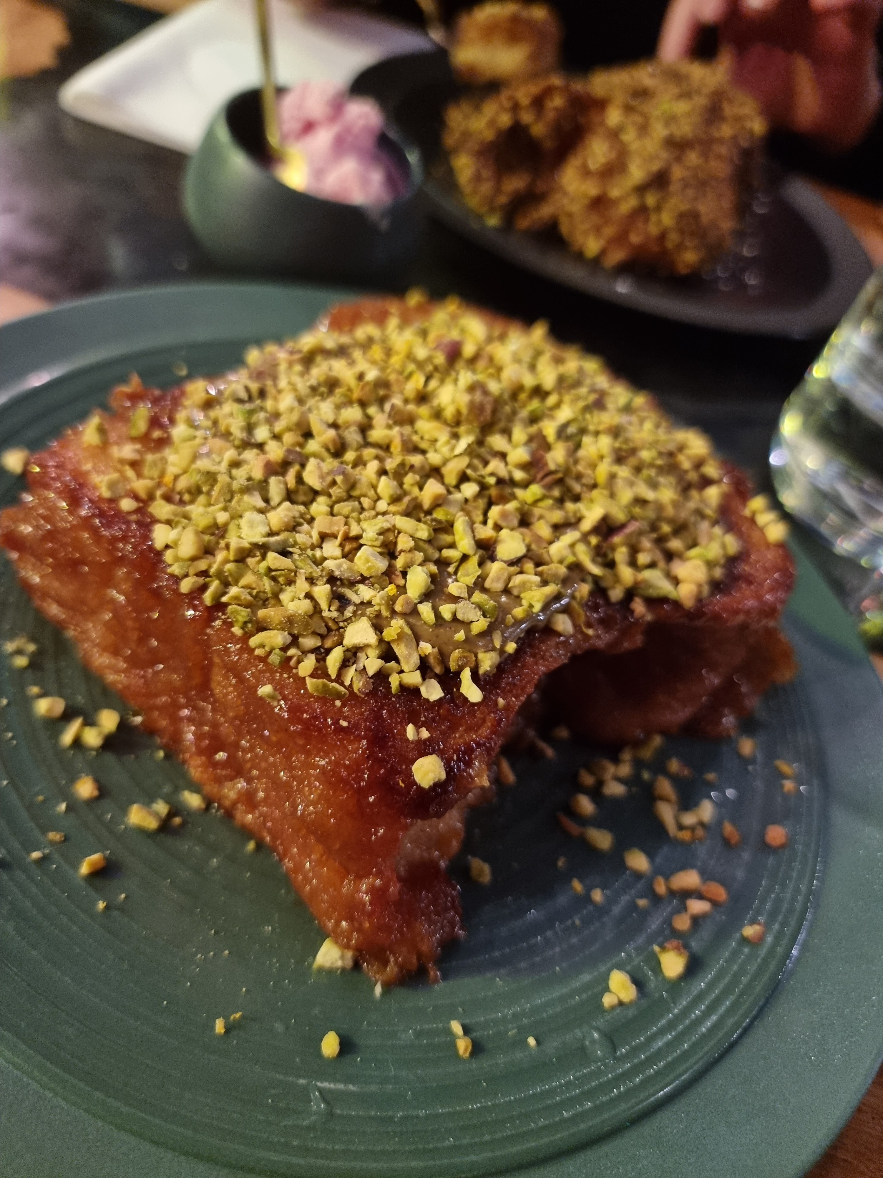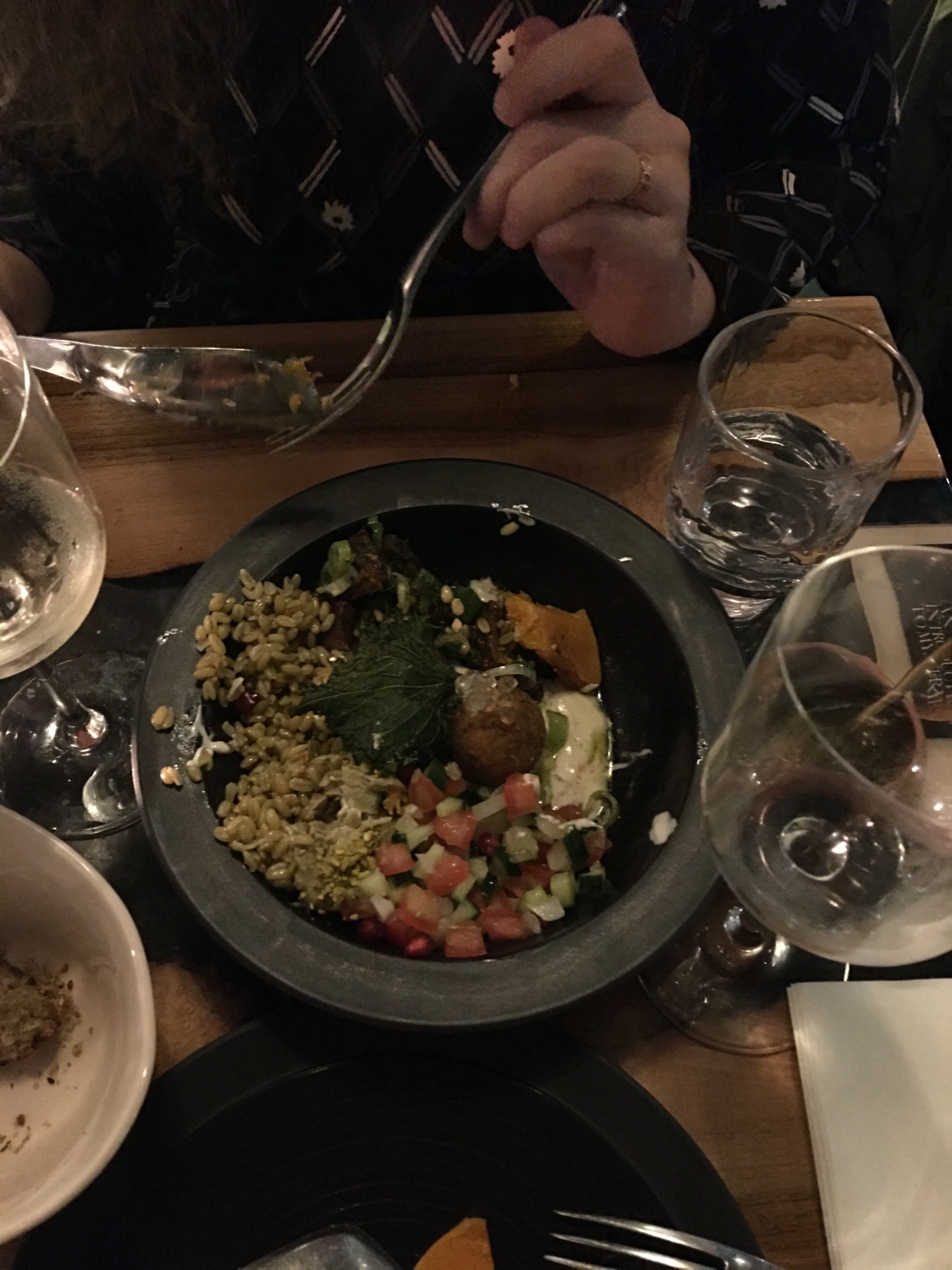 Nous nous sommes amusées. Pour le man’ouché au zaartar peut-être essayer de ramener un peu plus d’acidité pour casser le gras ? Plus de légumes ou d’herbes, un simple filet de citron arrangerait l’entrée. Halloumi grillé super bon avec le tehina ! Pour le prix de l’assiette orientale (25€!!) nous avons été déçues des quantités, complètement décorrelé de ce qui est présenté dans l’assiette (d’ailleurs franchement pour ce prix le visuel est à revoir, on peut commander un poké à 14€ pour ce prix). Le vin je vous recommande le Hermon Galilée, sec et qui se marie tb avec l’ensemble. ÉNORME BÉMOL : on ne nous laisse pas la bouteille à table et on nous ramène la bouteille bien entamée au 2e service alors que nous n’avons bu qu’un verre dedans. Nous étions 2, donc 2 verres servis seulement : la bouteille revient servie à moitié… ça craint à 40€ la bouteille. Sinon service agréable malgré un espace petit qui se fait oublié grâce aux miroirs de la salle.