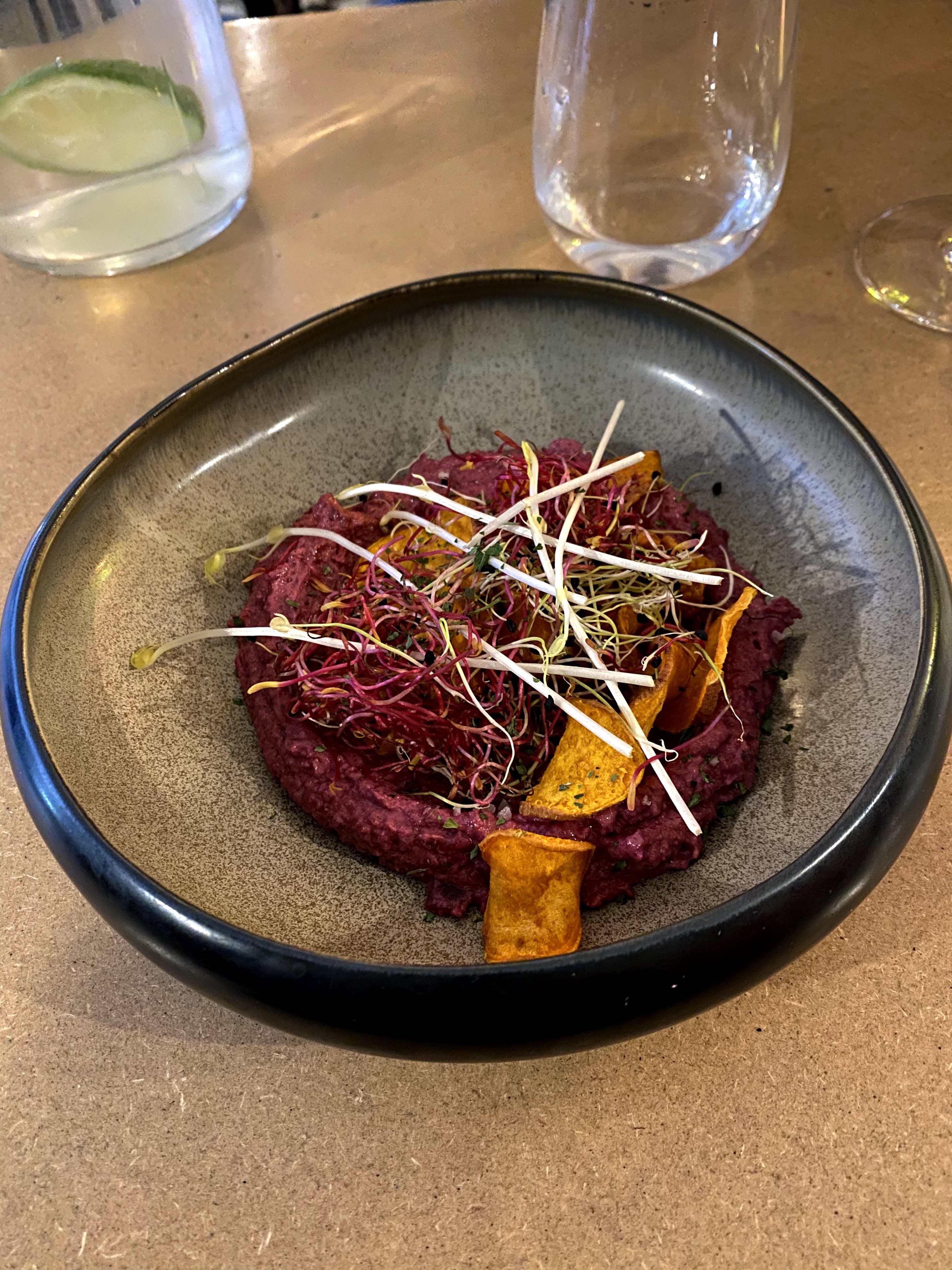 Petit restaurant sympa, joliment décoré, avec un bon accueil. La musique passée était sympathique aussi. Les plats sont délicieux, et ce type de cuisine change un peu, c'est intéressant. L'option végétalienne en entrée et en plat principal est vraiment un plus. Les prix sont corrects sauf les vins qui sont vendu trop cher pour les vins qu'ils sont. (Le houmous de betterave était délicieux et les aubergines caramélisées et le tofu était un plat recherché, très bien travaillé et d'un plaisir gustatif divin 😊). Je recommande cet endroit.