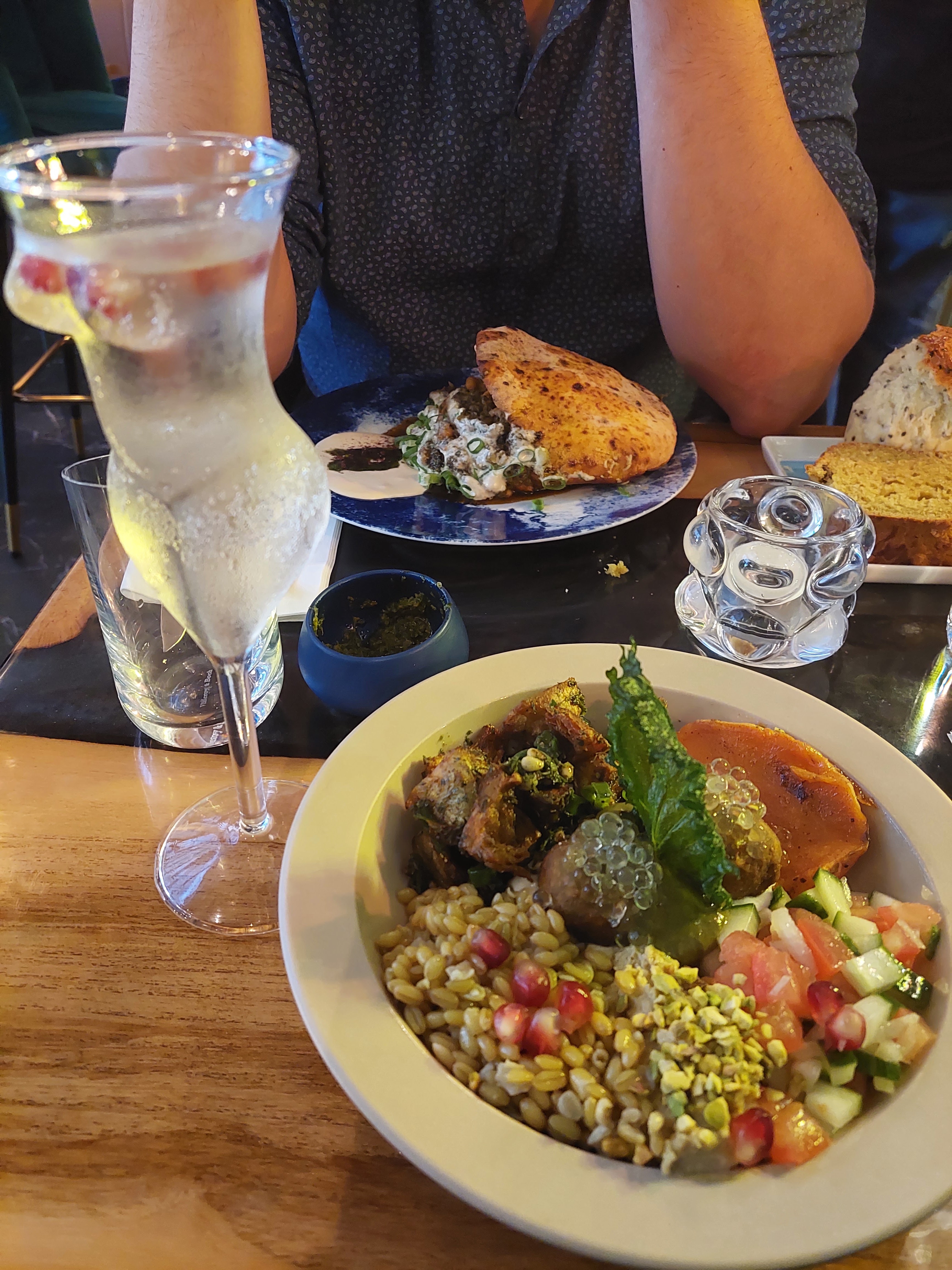 Nous avons passé un bon moment; l'accueil aimable, le service attentionné, le décor moderne et joli. Nous avons apprécié les surprises comme le pain en apéritif avec la sauce aux herbes et la barbe à papa qui fait son petit effet. Les cocktails sont bons. Néanmoins, nous n'avons pas tout aimé, notamment les boulettes fades et nous avons trouvé le rapport qualité prix décevant. C'est très cher pour une pita même si elle est globalement satisfaisante. Pour ce prix; il faudrait davantage voyager par l'ambiance, le goût... En outre, notre invité a attrapé froid, peut-être faudrait-il mettre le rideau tout le long de la porte d'entrée. Au final je pense que ce restaurant a beaucoup de potentiel et peut vraiment devenir excellent.
