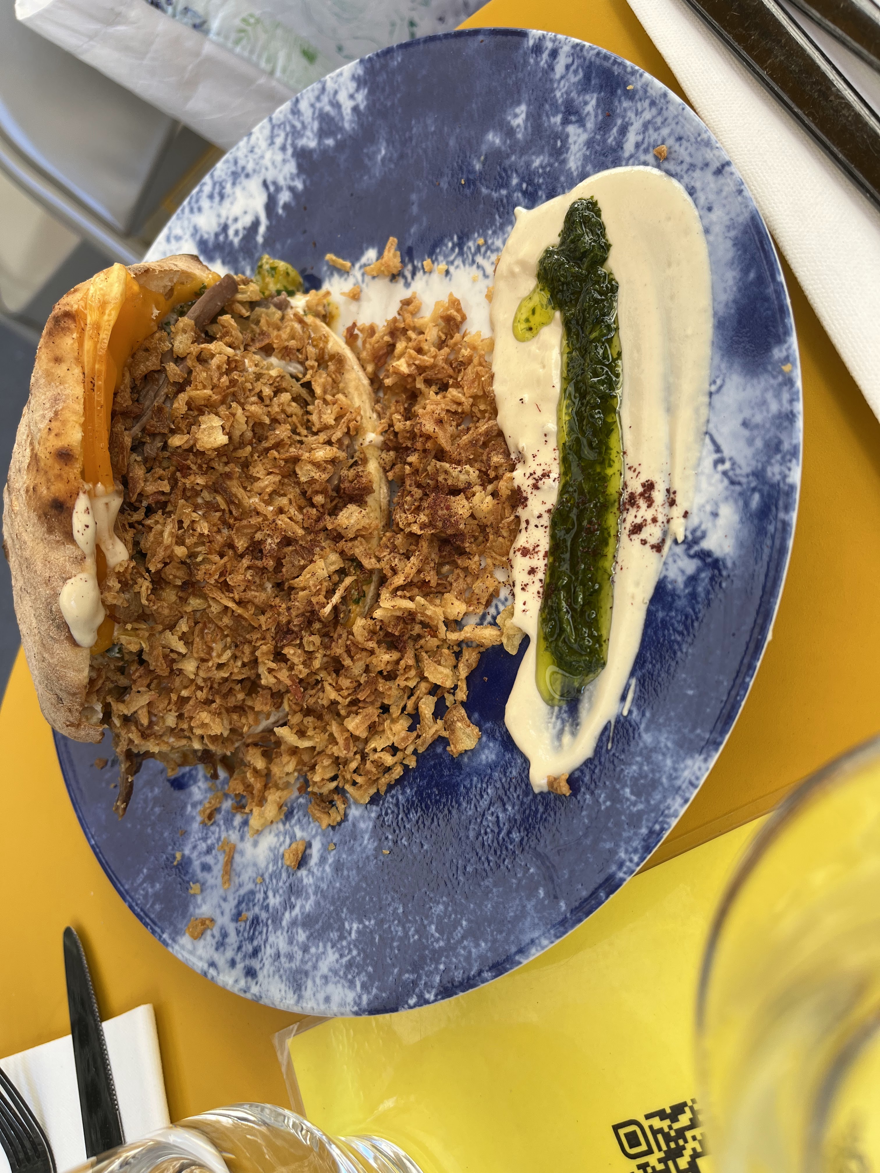 Une des meilleures expériences culinaires que j'ai eu à Paris. La nourriture est délicieuse, les portions généreuses et le personnel très sympathique. Dans l’ensemble, c’est une super expérience! Le seul inconvénient était qu'après avoir grimpé dans la chaleur, nous avions vraiment soif et avons dû attendre assez longtemps pour que l'eau arrive, mais après cela, le service n'a été que fluide ! Le pain qu'ils proposent au début est tellement délicieux, avec des noix et des épices. Ensuite, nous avons partagé la fricasse au thon en entrée, pris du pita au bœuf et du pain perdu à la pistache. Les saveurs de chaque plat ne ressemblaient à rien de ce que nous avions goûté auparavant (dans le bon sens) et les portions étaient vraiment généreuses, donc c'est une bonne chose que nous ayons tout partagé car pour une seule personne, il serait impossible de tout finir. Vraiment un excellent dîner et un bon rapport qualité/prix. Merci beaucoup