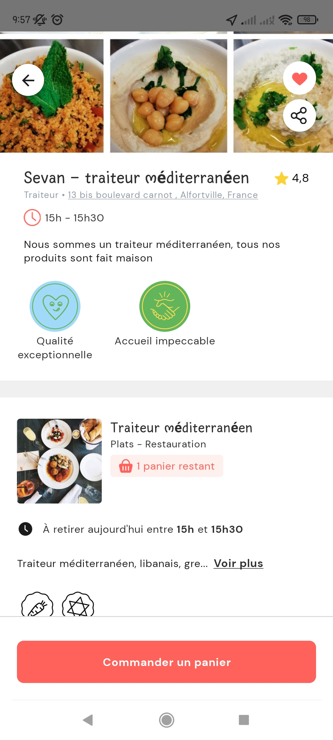 Très bien ce commerçant qui participe à la lutte contre le gaspillage alimentaire via Phenix. J'irais chercher 3 paniers/repas cet après-midi et reviendrai dire comment c'est 😋 Résultat 3 repas traiteurs cuisine méditerranéenne dont chaque plats même inconnu fut un régal pour nos papilles. Barquettes plastiques bien garnies, mais Attention NON micro ondable.