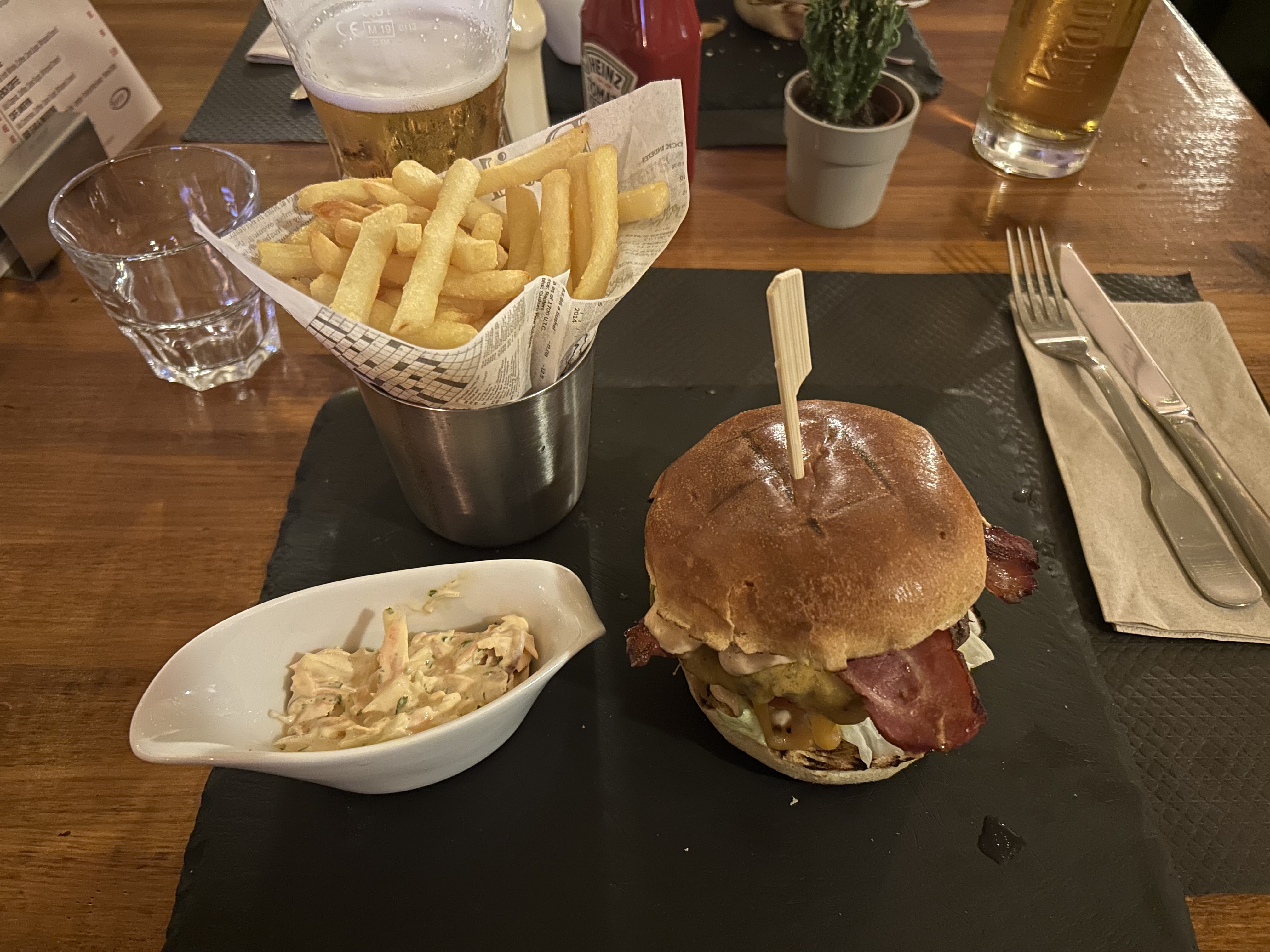 Nous avons eu la chance d'avoir une table sans réservation. Notre serveur, Mave, était absolument exceptionnel et nous a fourni des recommandations pertinentes. Pour les boissons, nous avons dégusté un demi-pichet de vin rouge, ce qui s'est avéré suffisant pour nous deux. Nos plats principaux ont dépassé les attentes ; le steak était cuit à la perfection, comme je l'avais demandé, et les côtes de porc étaient incroyablement tendres. Sans aucun doute, nous revisiterions cet établissement et le recommanderions sans réserve à tous les visiteurs, surtout après une journée sur les pistes !